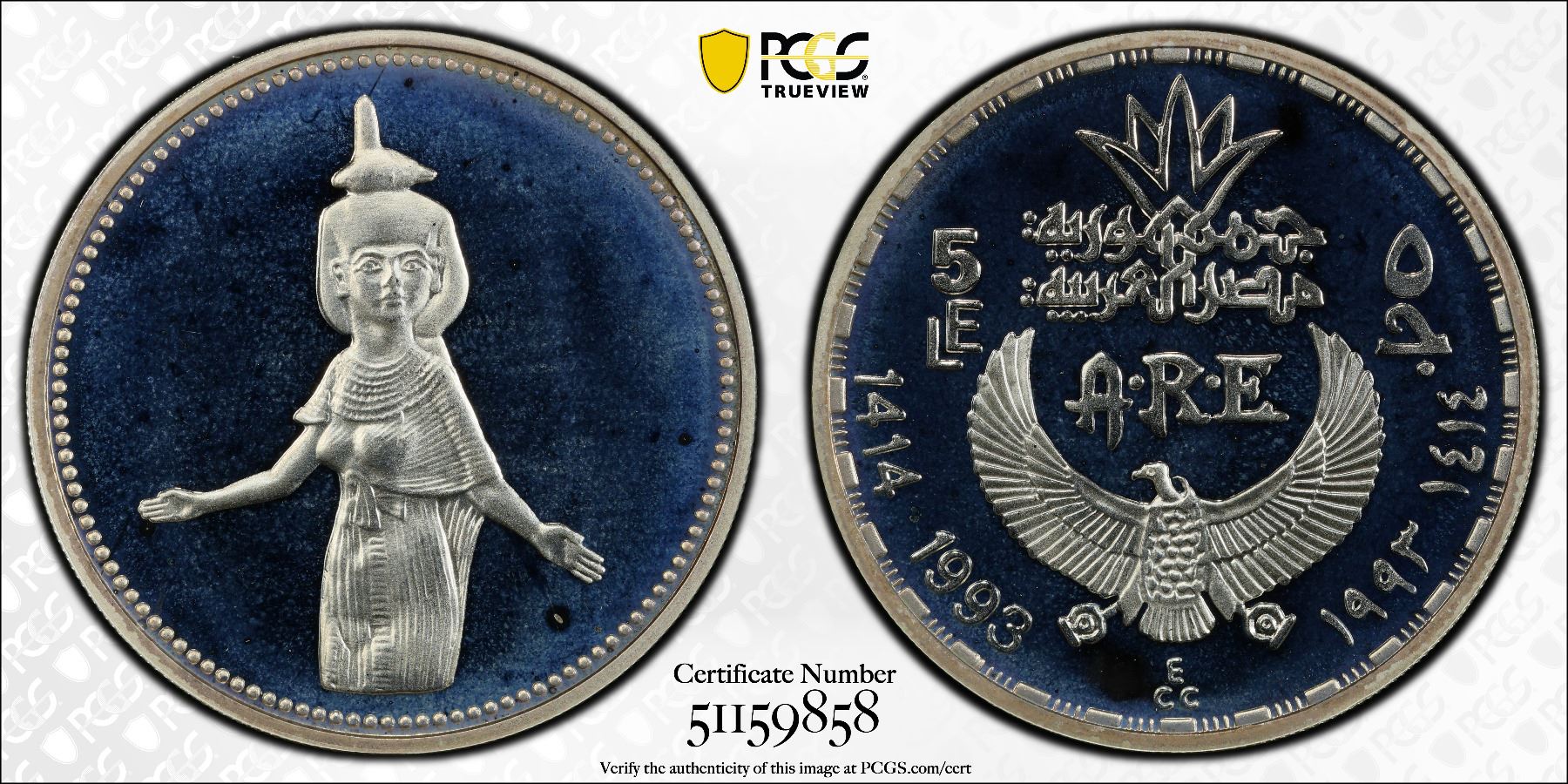 EGYPT: Republic, AR 5 pounds, 1993/AH1414, KM-743, Ancient Treasure – Serket, a spectacular example, PCGS graded PF68 Deep Cameo.