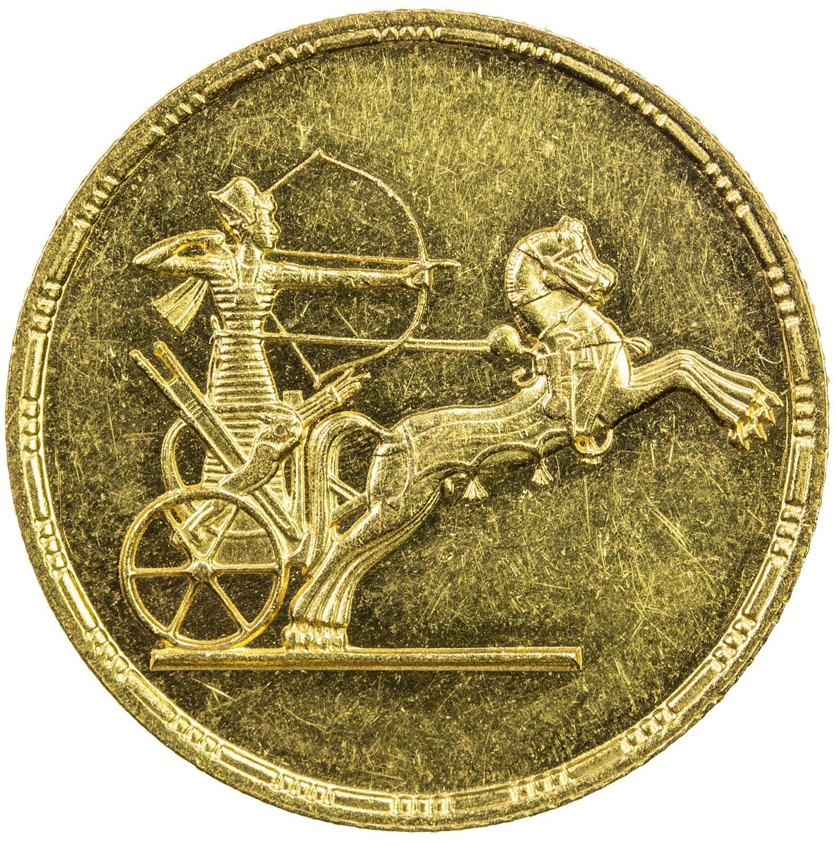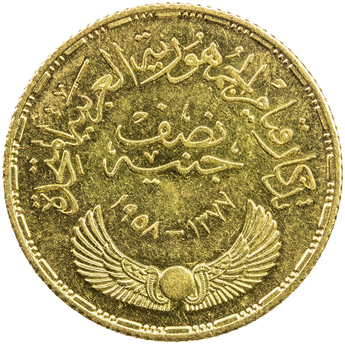 EGYPT: United Arab Republic, AV ½ pound, 1958/AH1377, KM-391, Ramses II on his chariot, commemorating the Formation of the United Arab Republic (unification of Egypt and Syria) in 1958, Brilliant Unc, ex Gamal Amer Collection.