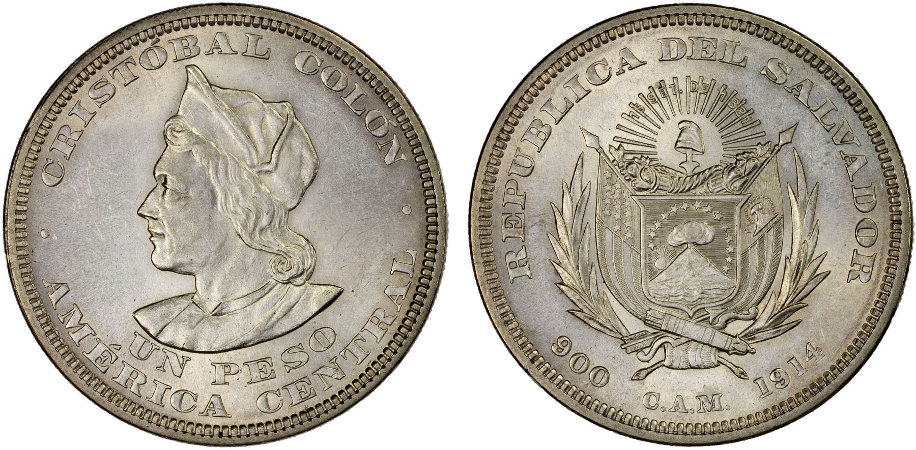 EL SALVADOR: Republic, AR peso, 1914, KM-115.2, initials C.A.M. ("Central American Mint"), wide shoulder variety, a lovely coin with only a handful of barely noticeable hairlines, Unc. Minting in El Salvador came to an end in 1896. Due to high production costs, minting coins locally turned out to be a bad deal for the Salvadoran government; the old mint building was then occupied by National Printing. The subsequent production of silver coins was made by various mints in Europe and the United States until 1914. These issues were still carrying the initials C.A.M. (Central American Mint).