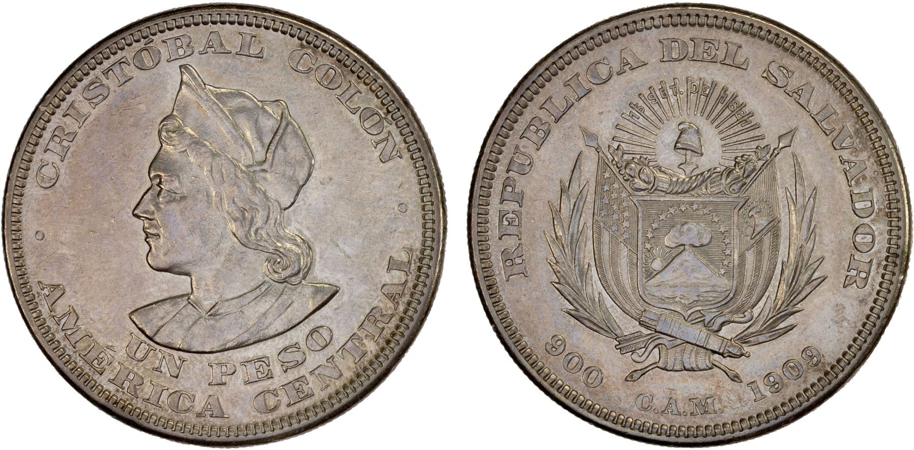 EL SALVADOR: Republic, AR peso (colon), 1909 C.A.M., KM-115.2, lightly cleaned, starting to retone, XF.