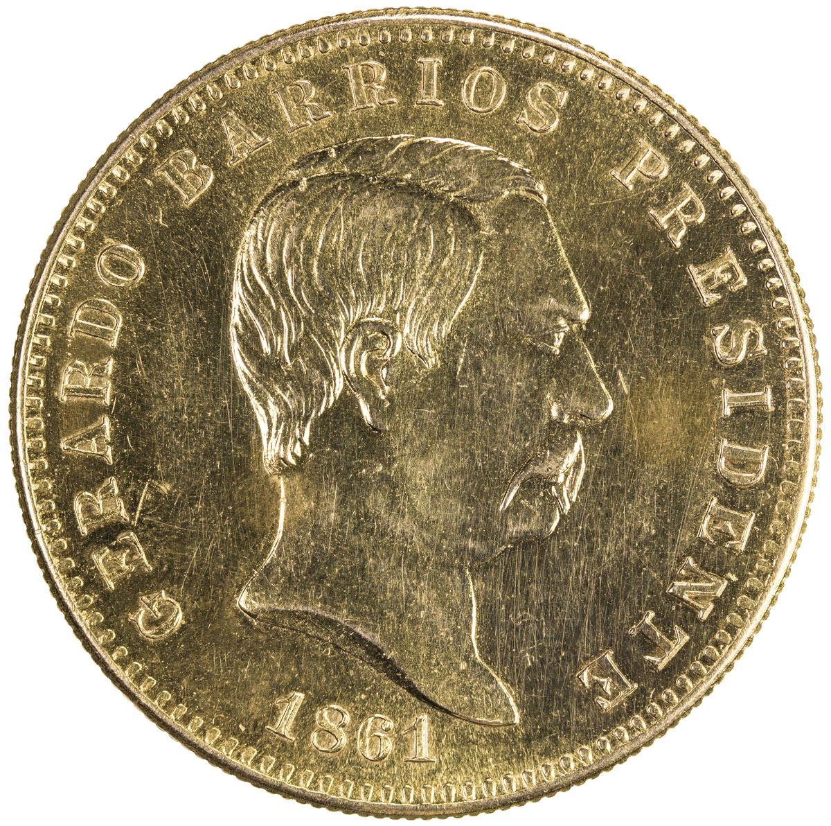 EL SALVADOR: Republic, AV 20 pesos (29.54g), 1861, pattern fantasy essai, struck circa 1960, Unc, RR. Gerardo Barrios (1813-1865) was President of El Salvador, from 12 March 1859 to 26 October 1863. Barrios was a liberal and supported the unity of Central America. He was, from a young age, part of the army of the last president of the Federation of Central American Estates, Francisco Morazan. After Morazon's death he became the leader of the unionist movement. He served as president of El Salvador several times - in 1858, from 1859 to 1860 and again from 1861. He was known for his concern for international relations and is attributed for introducing coffee production to El Salvador, accelerating the spread through Central America.