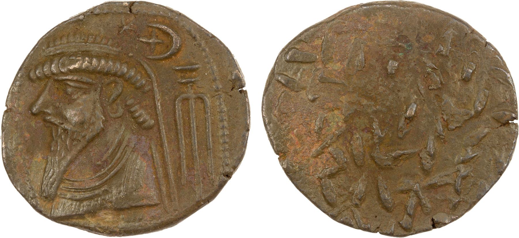ELYMAIS: Anonymous Ruler, late 1st century BC to 1st AD, AE tetradrachm (15.11g), van't Haaff-10.4, diademed bust left, anchor to right, star-and-crescent and additional star above // completely stylized designs, well-centered strike, nice brown patina, EF.