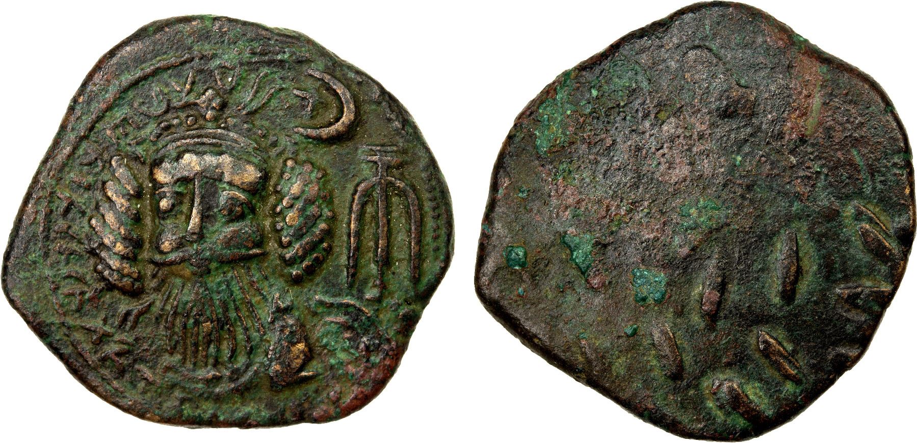ELYMAIS: Kamnaskires-Orodes III, mid-2nd century AD, AE tetradrachm (15.81g), Van't Haaff-12.1, facing bust, long beard, tiara crown, anchor and star-and-crescent to right // many short dashes, attractive patination, VF.