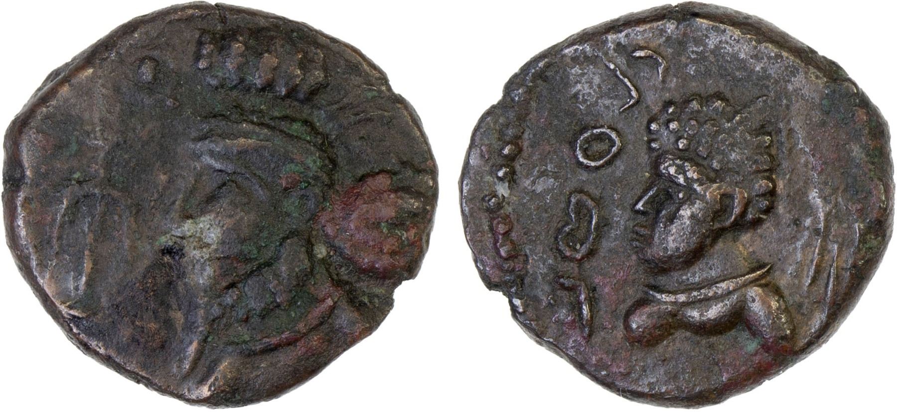 ELYMAIS: Orodes IV, ca. late 2nd century AD, AE drachm (2.51g), van't Haaff-17.1-1-2, diademed and draped bust left // draped female bust with long braid left, Aramaic legend WLP'N to left, bold attractive reverse, Choice VF. The female figure on the reverse is thought to be the queen of Orodes IV and her name is reconstructed as Ulfan.