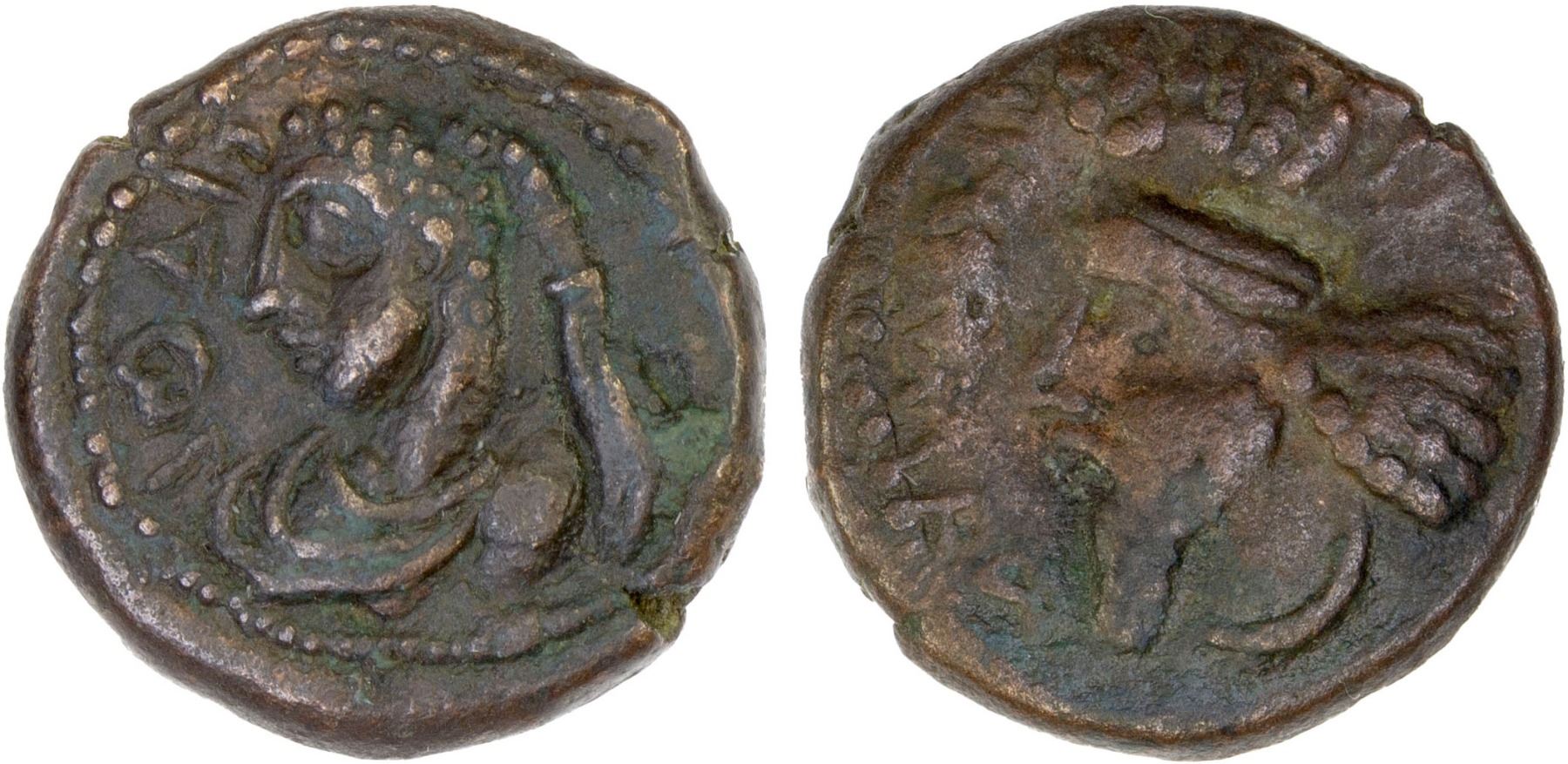 ELYMAIS: Orodes IV, ca. late 2nd century AD, AE drachm (3.37g), van't Haaff-17.1-1-1, diademed and draped bust left // draped female bust with long braid left, Aramaic legend WLP'N to left, bold attractive reverse, Choice VF. The female figure on the reverse is thought to be the queen of Orodes IV and her name is reconstructed as Ulfan.