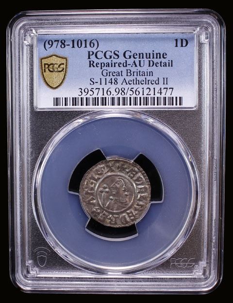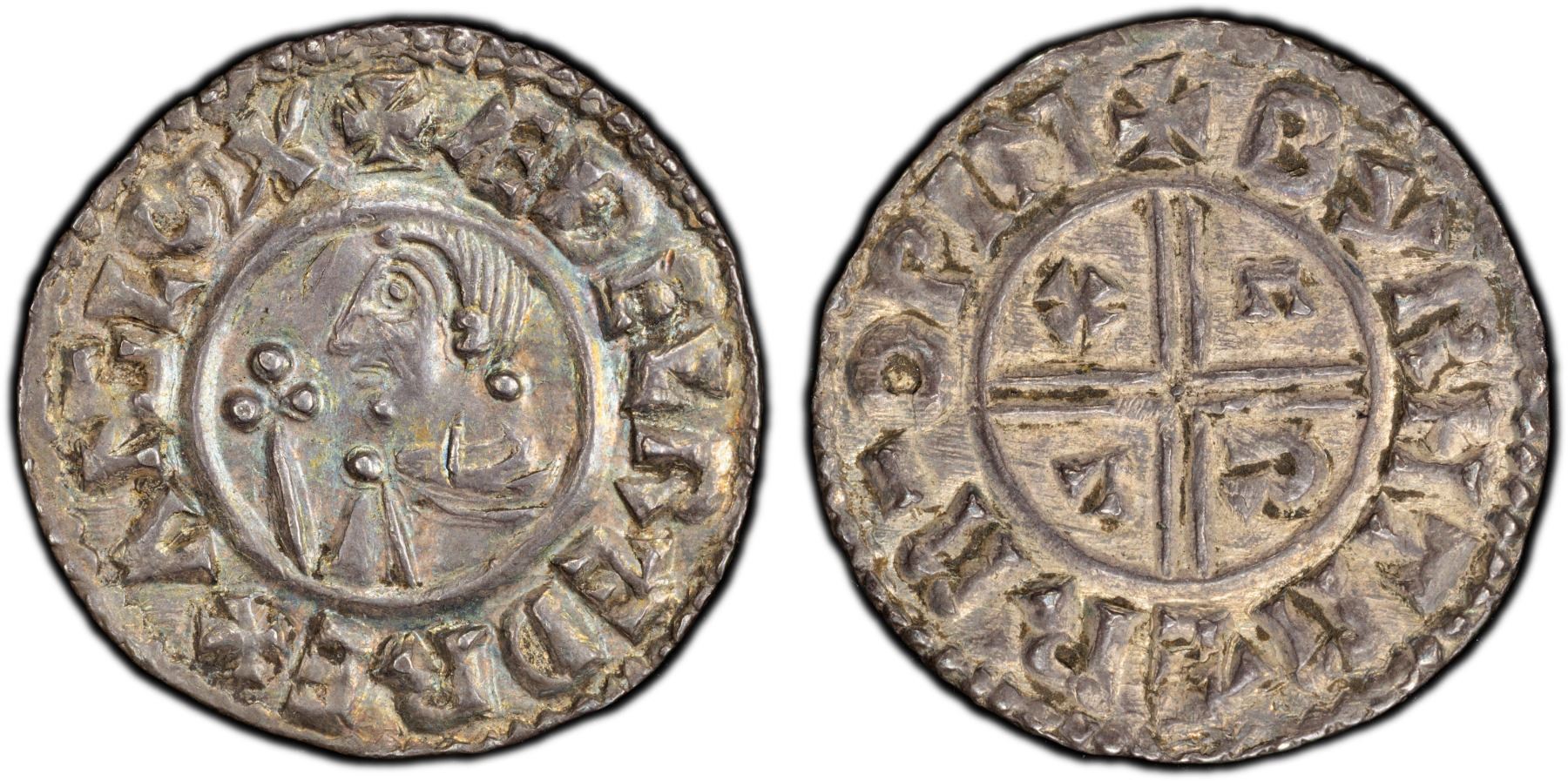 ENGLAND: Aethelred II, 978-1016, AR penny (1.66g), Winchester, S-1148, N-770, moneyer Brihtmaer, faint repair work, a lovely toned lustrous example! PCGS graded AU details, ex Morton & Eden Auction 113, Lot 428; ex Dr E. Burstal Collection.
