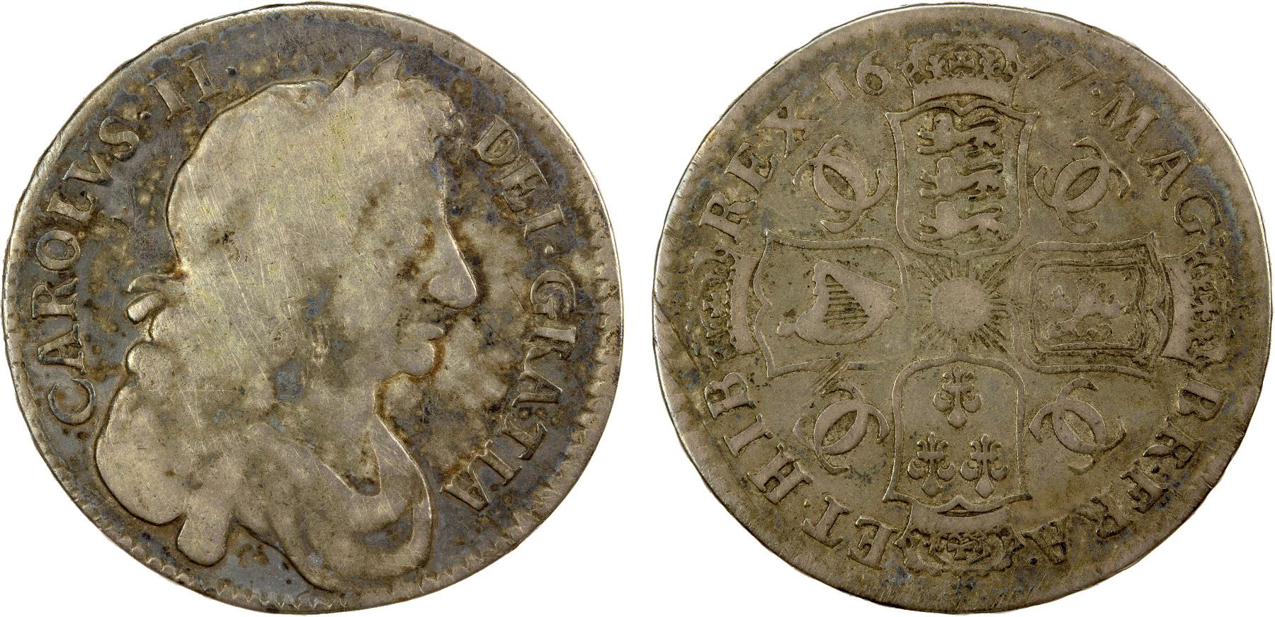 ENGLAND: Charles II, 1660-1685, AR 1/2 crown, 1677, VG