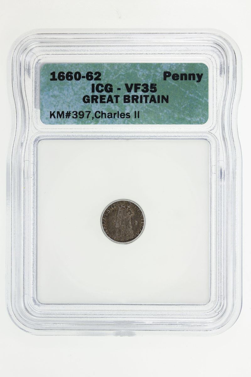 ENGLAND: Charles II, 1660-1685, AR penny, Tower (London) mint, ND (1660-2), KM-397, S-3389, ICG graded VF35.
