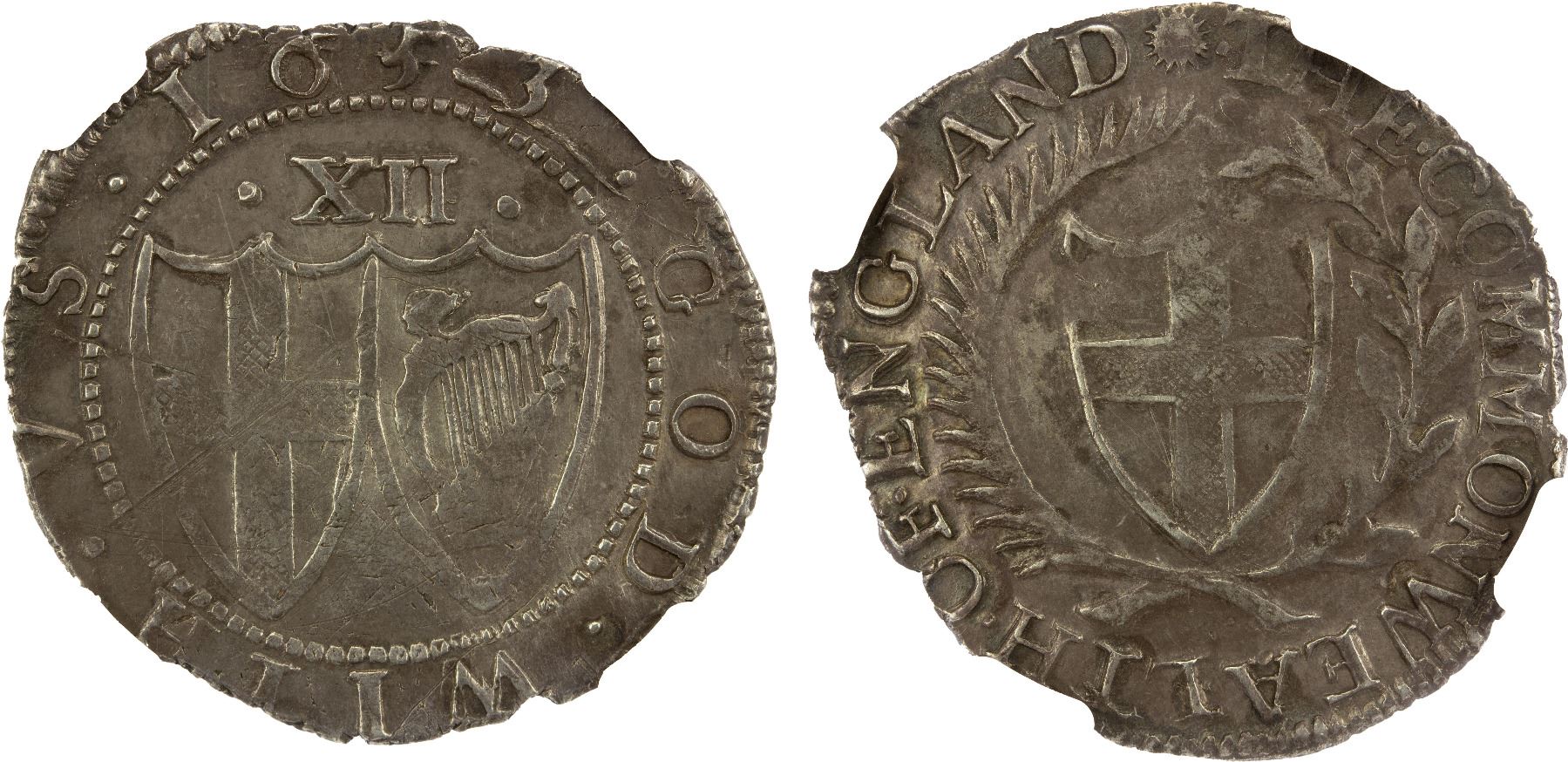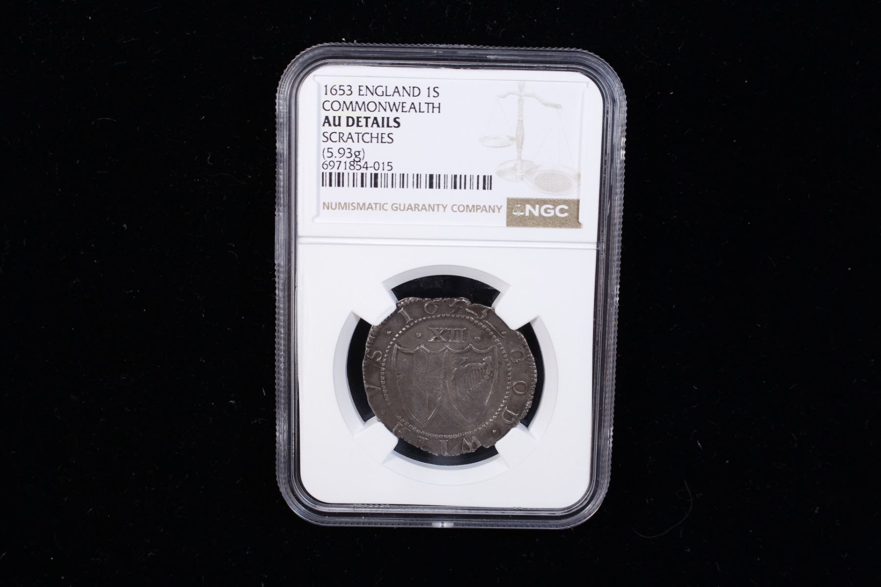 ENGLAND: Commonwealth, AR shilling, 1653, KM-390, S-3217, shields of England and Ireland, sun mintmark, scratches, NGC graded AU details.