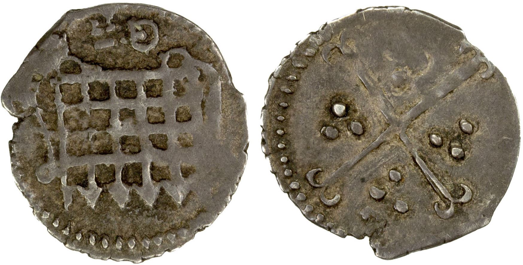 ENGLAND: Elizabeth I, 1558-1603, AR halfpenny (0.22g), ND (1595-8), North-2018, Spink-2581, Sixth Issue, Tower Mint issue, portcullis // cross moline with 3 pellets in each angle, somewhat crude flan, VF, ex Joe Sedillot Collection.