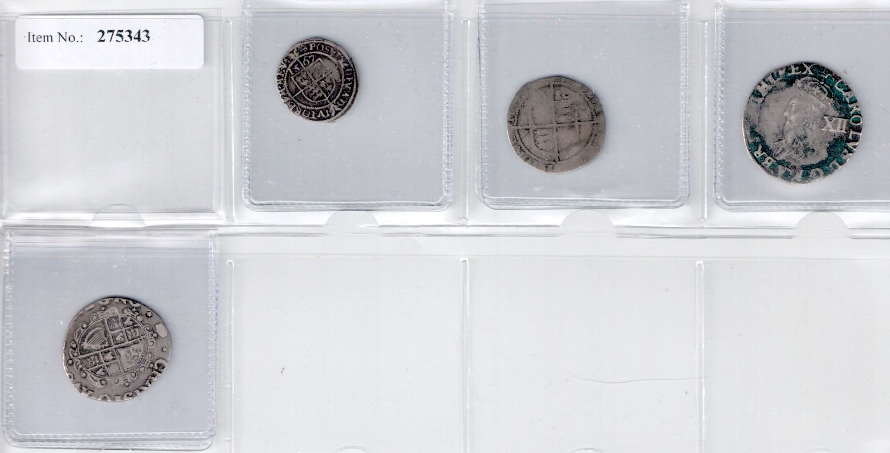 ENGLAND: LOT of 4 hammered silver coins: 1) Elizabeth I 3 pence 1567, 3rd & 4th issue, S-2565, North-1998, bold F-VF; 2) 6 pence 1580, 5th issue, worn; 3) Charles I shilling, group D, type 3a, S-2791, North-2225, F-VF light encrustation; and 4) shilling, same type as previous, VG clipped; retail value $250, lot of 4 pieces.