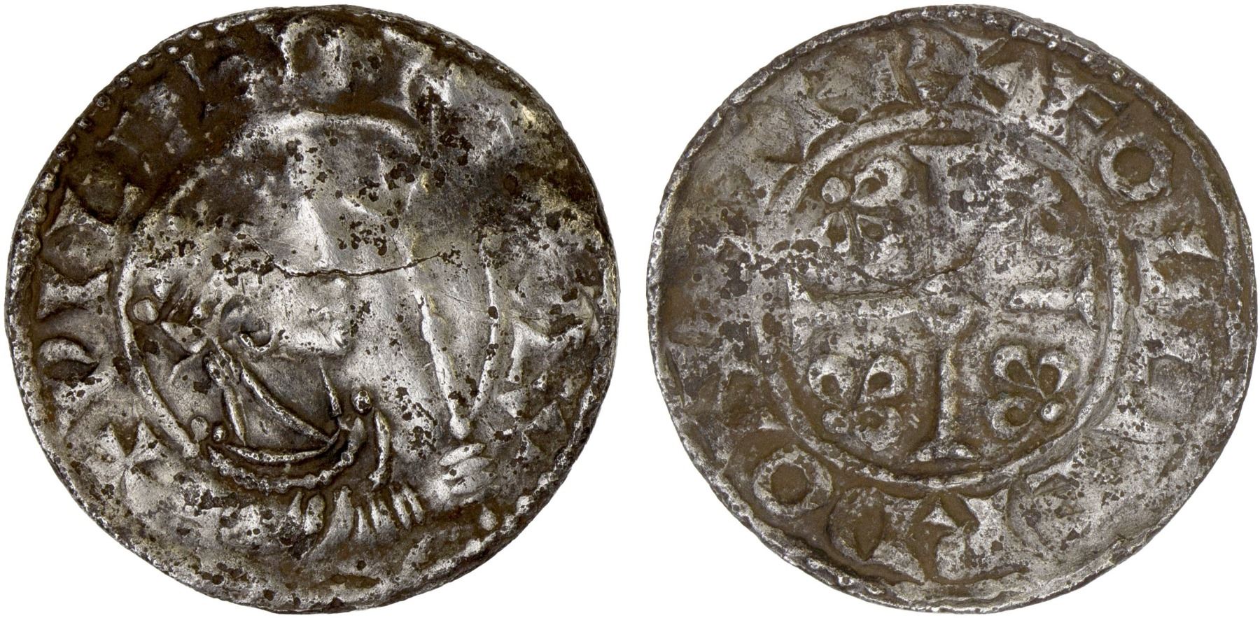 ENGLAND: William I 'the Conqueror', 1066-1087, AR penny (1.30g), Thetford, ca. 1080-83, S-1256, N-847, profile right type, moneyer Folcard, crowned bust right, holding scepter, + PILLELM REX // short cross pattée, voided trefoil in each quarter, + FOLCÆRD ON ÐTFR, crinkled, small crack in center, some porosity, rare, F-VF.
