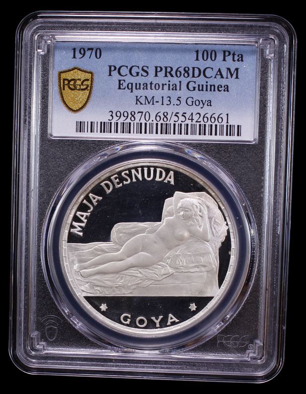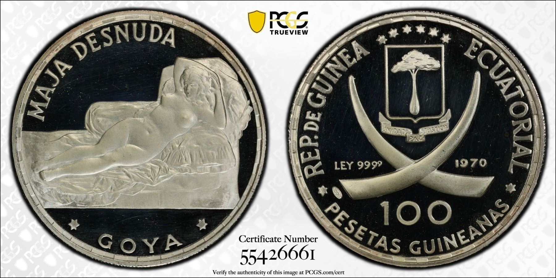 EQUATORIAL GUINEA: Republic, AR 100 pesetas guineanas, 1970, KM-13.5, Goya La maja desnuda issue, a spectacular example, PCGS graded PF68 Deep Cameo.