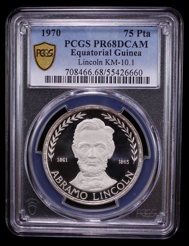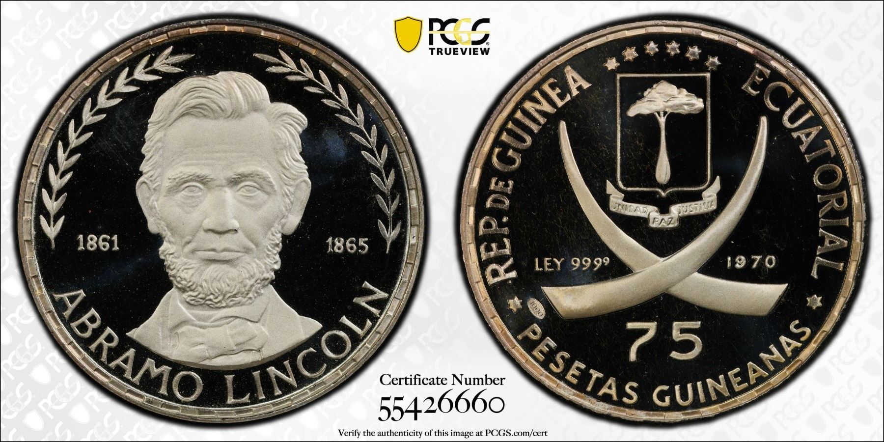 EQUATORIAL GUINEA: Republic, AR 75 pesetas guineanas, 1970, KM-10.1, Abraham Lincoln commemorative, a spectacular example, PCGS graded PF68 Deep Cameo.