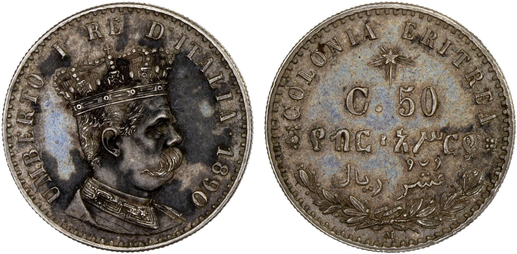 ERITREA: Umberto I, 1878-1900, AR 50 centesimi, 1890-M, KM-1, one-year type, with much prooflike luster, some discoloration, AU-UNC Possibly a proof or an early strike.