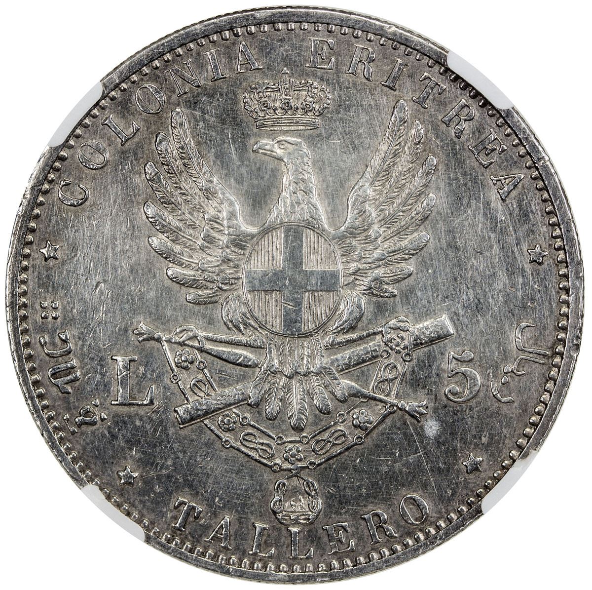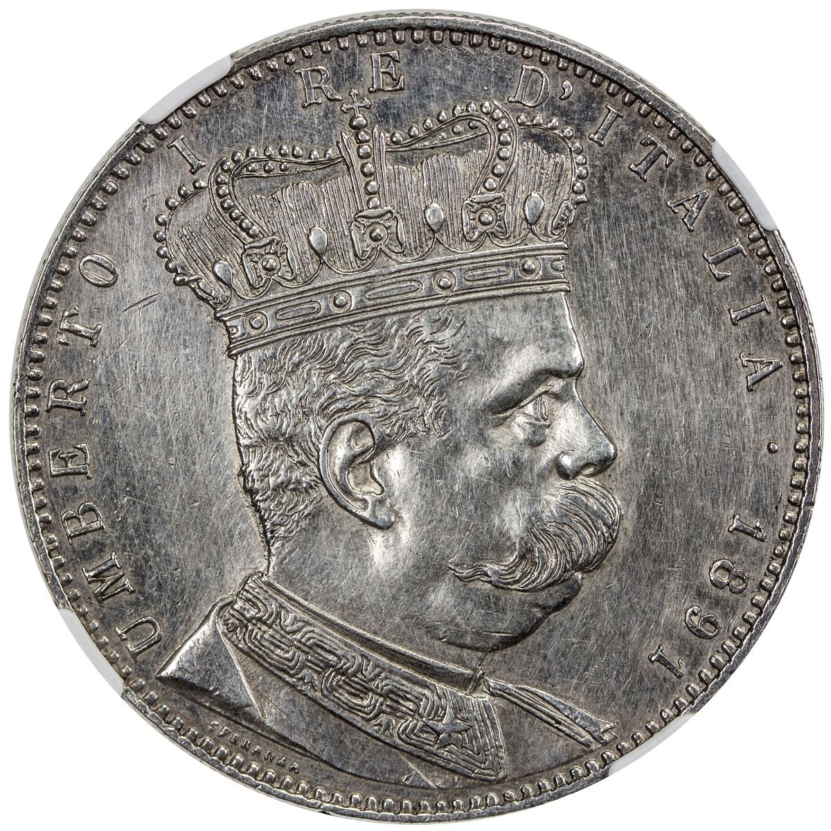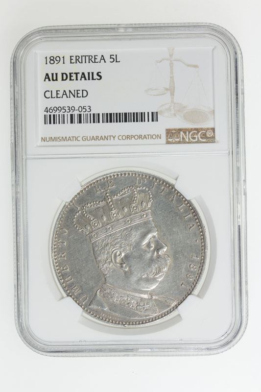 ERITREA: Umberto I, 1889-1900, AR 5 lire, 1891, KM-4, NGC graded About Unc details (cleaned).