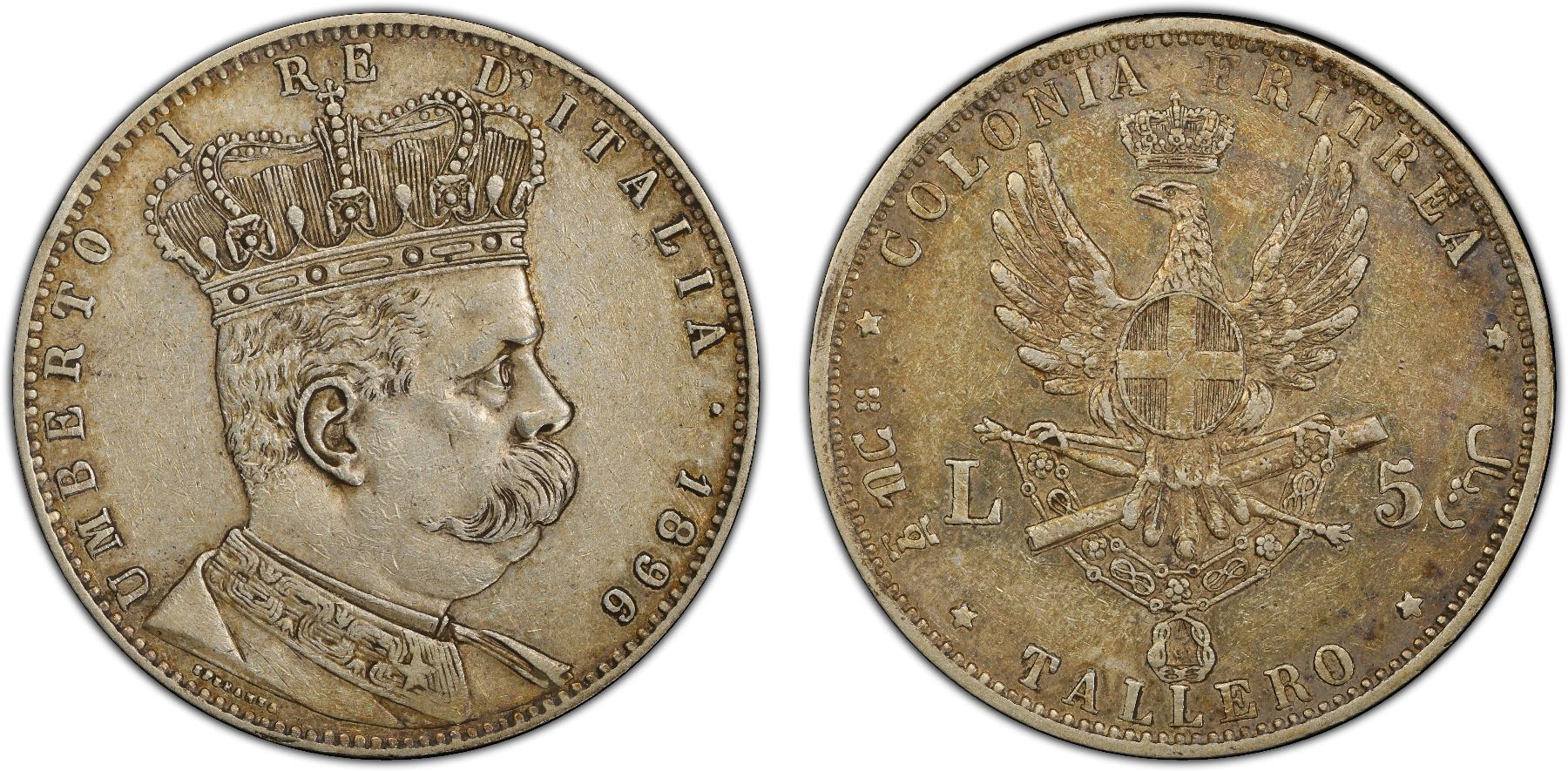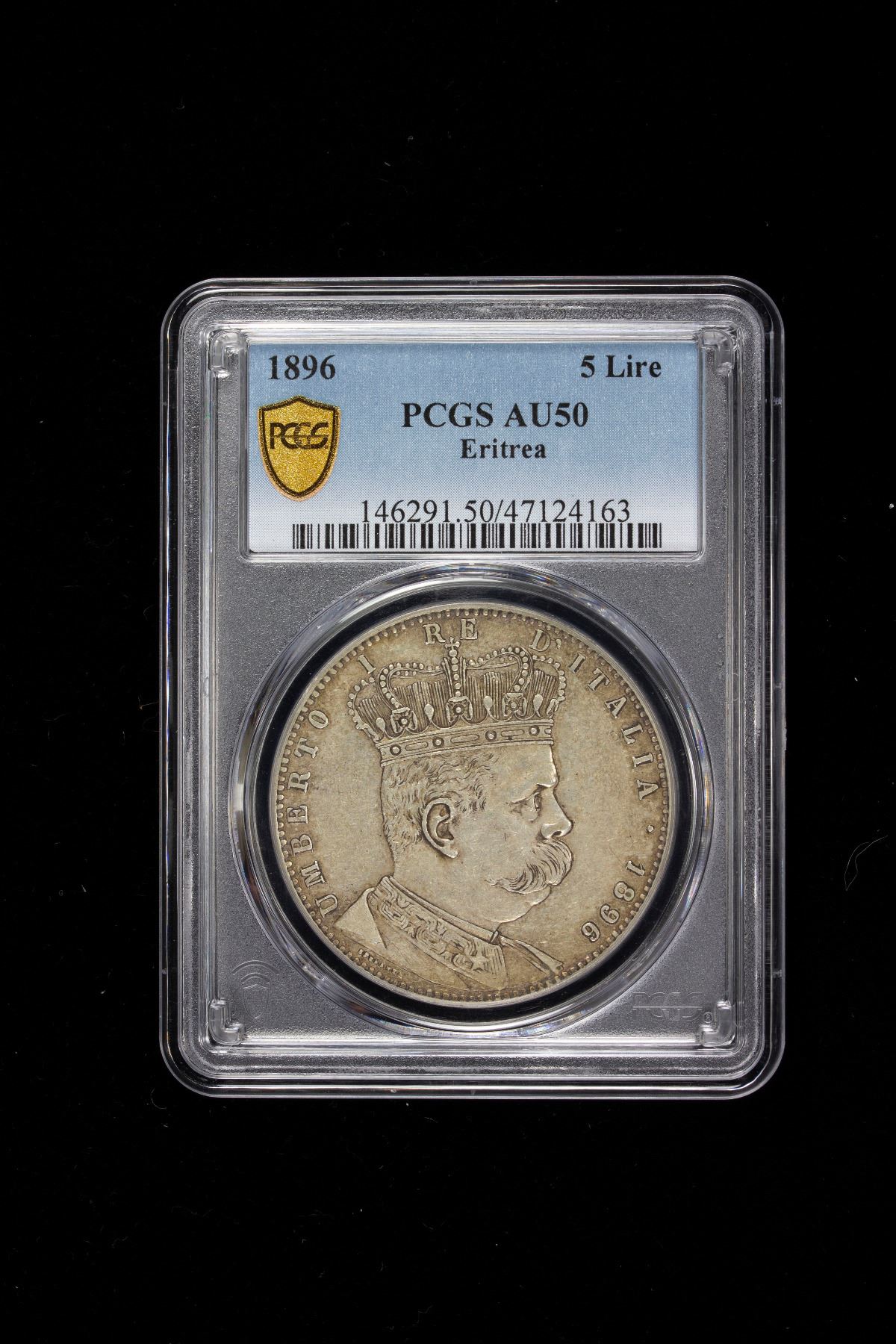 ERITREA: Umberto I, 1889-1900, AR 5 lire / tallero, 1896, KM-4, scarce two-year type, PCGS graded AU50, S. The tallero (= thaler) or rial was the currency of Eritrea between 1890 and 1921. It was worth five lire and was subdivided into ten decimi. 80,069 coins of the total mintage of both dates of this type were later taken out of circulation and melted down.
