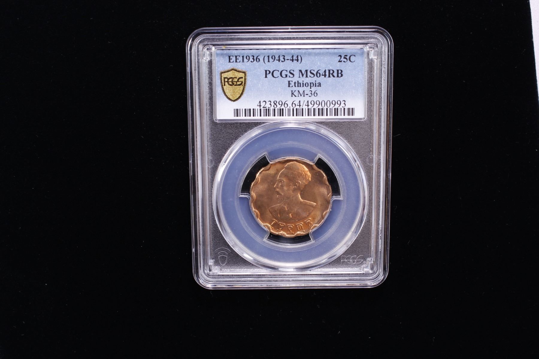ETHIOPIA: Haile Selassie I, 1930-1974, AE 25 santeems, EE1936 (1944), KM-36, type A, scalloped with 14 smooth notches with reeded peaks, a wonderful lustrous mint state example! PCGS graded MS64 RB. Issued in 1952 and 1953. Struck at the United States Mint of Philadelphia.