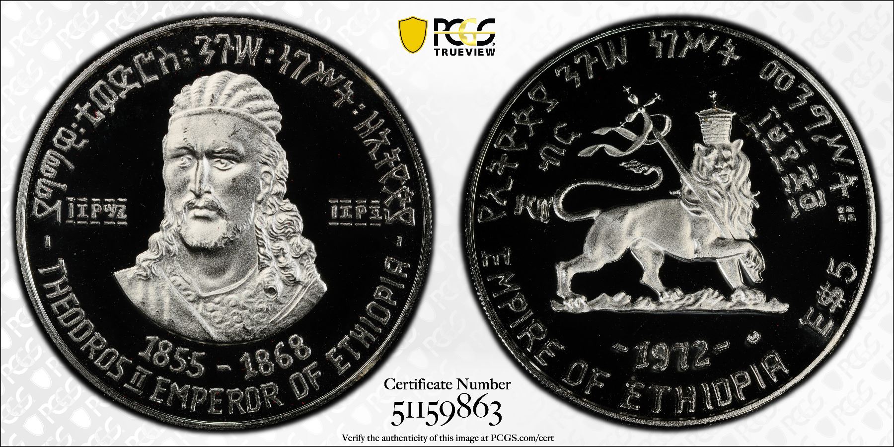 ETHIOPIA: Haile Selassie I, 1930-1974, AR 5 dollars, EE1964 (1972), KM-48, Emperor Theodros II, a spectacular example, PCGS graded PF68 Deep Cameo.