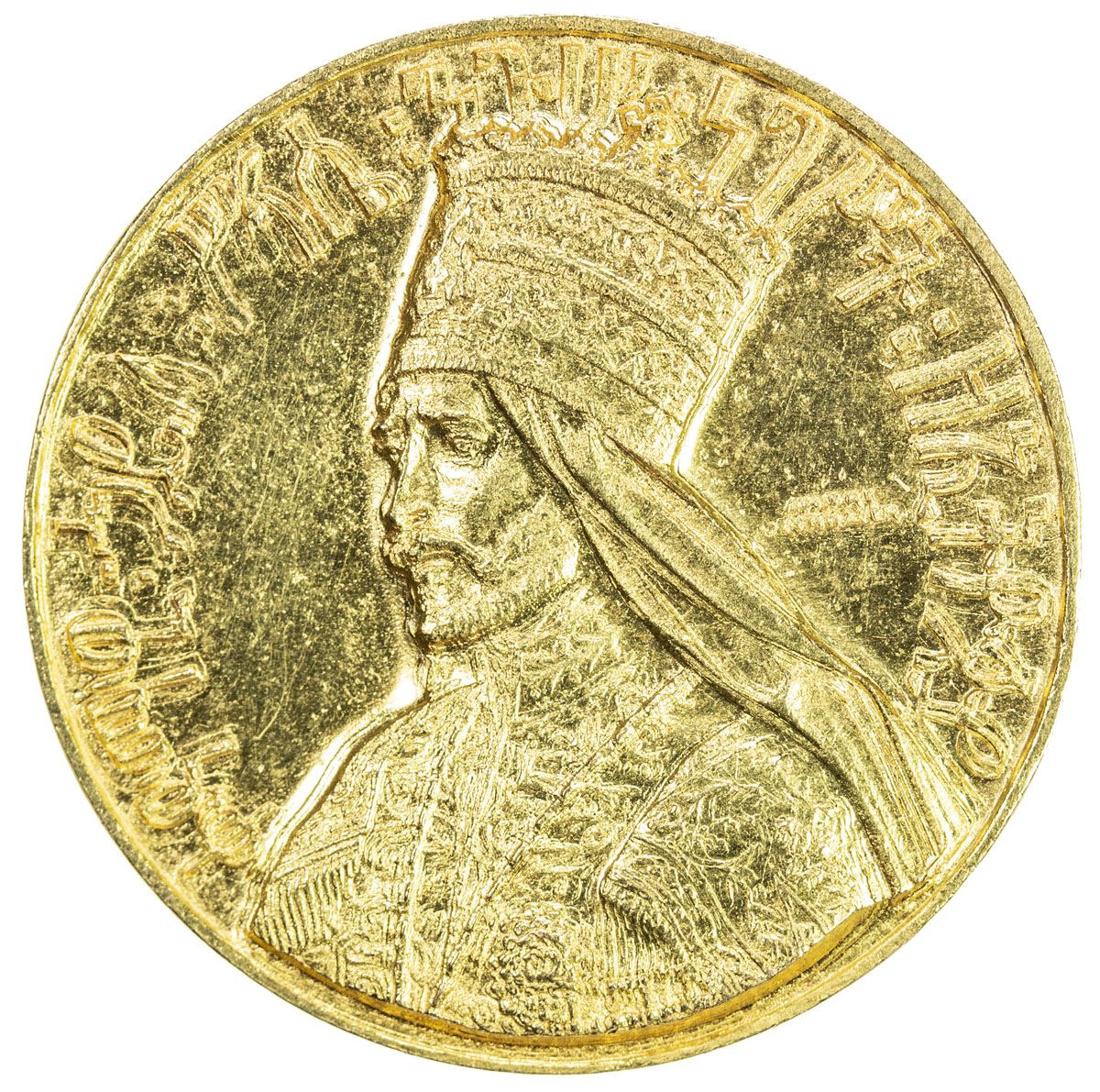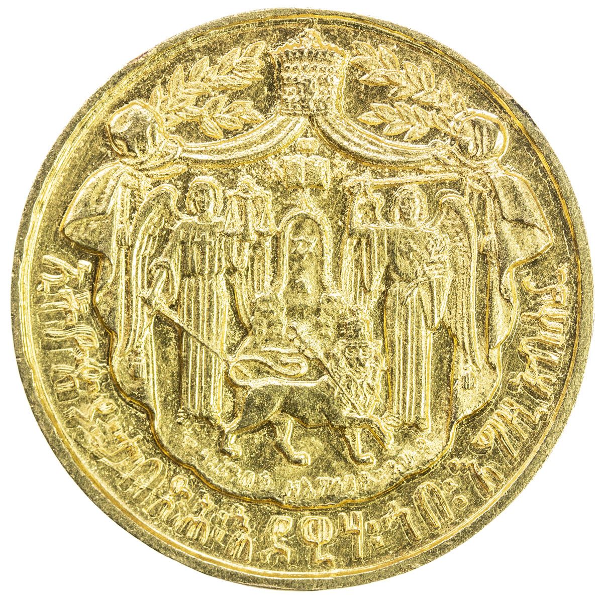 ETHIOPIA: Haile Selassie I, 1930-1974, AV medal (19.08g), EE1923 (1930), Gill-S15 var, 30mm, Haile Selassie Coronation Gold Medal; elaborate crowned facing bust of Haile Selassie, the date in tiny Ethiopian numerals at the base of the bust, without the designer's name // throne of Solomon between two angels, one holding sword and scales of justice, the other holding sword and sprig, lion passant before, carrying the standard, plain edge, AU. The weight can vary considerably on these, with the weights proposed by Gill quite theoretical, as these were likely struck by a number of local goldsmiths from a number of different dies.