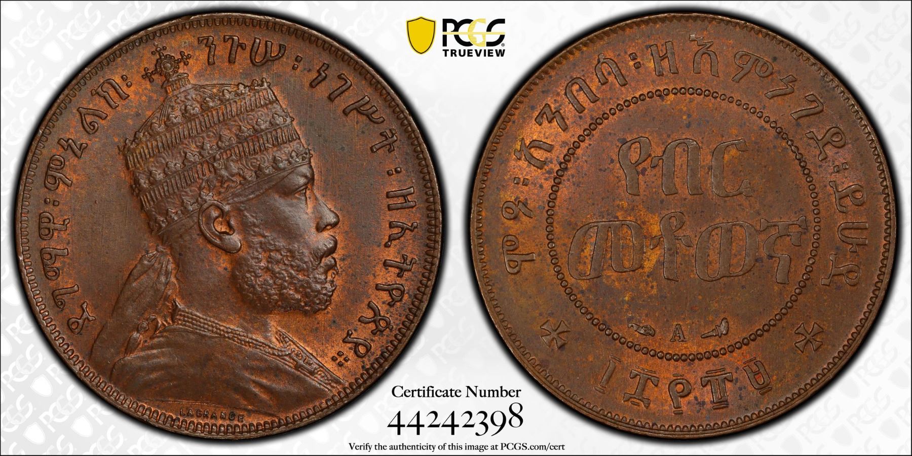 ETHIOPIA: Menelik II, 1889-1913, AE 1/100 birr, EE1889 (1897), PCGS MS64 BN