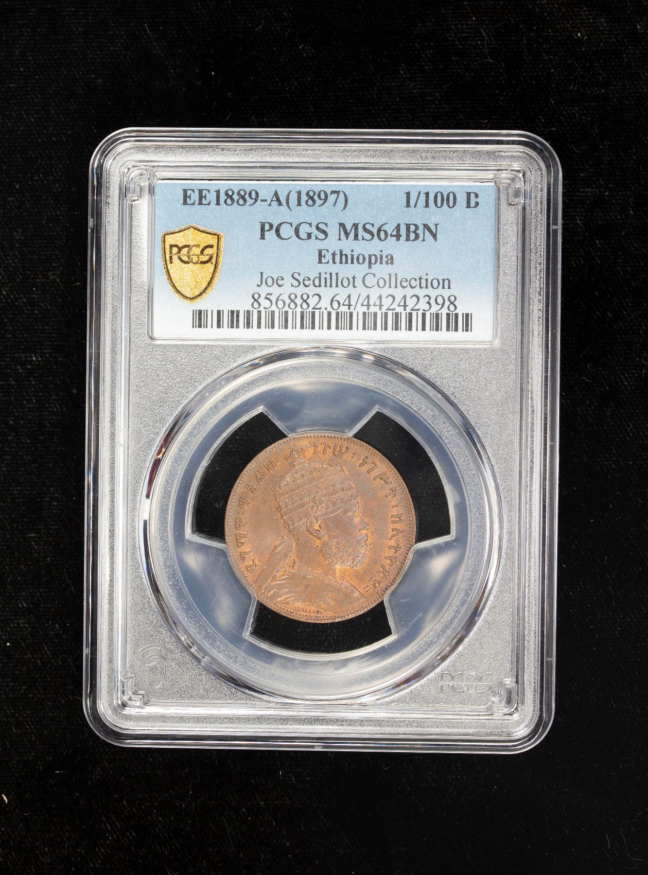 ETHIOPIA: Menelik II, 1889-1913, AE 1/100 birr, EE1889 (1897), KM-9, a wonderful quality example! PCGS graded MS64 BN, ex Joe Sedillot Collection.