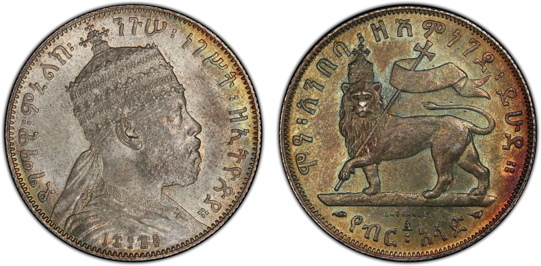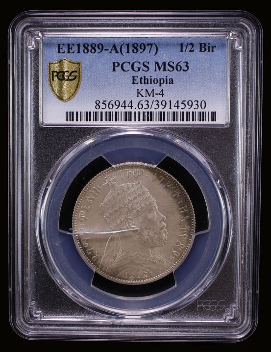 ETHIOPIA: Menelik II, 1889-1913, AR 1/2 birr, EE1889-A (1897), KM-4, Schön-5, nicely toned, especially on reverse, PCGS graded MS63. There is a small crack on front of slab.