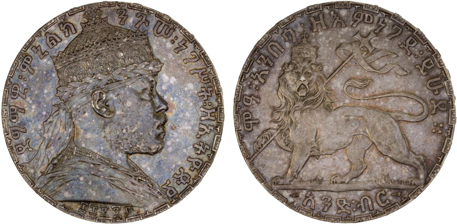 ETHIOPIA: Menelik II, 1889-1913, AR birr, EE1892 (1900), KM-19, lightly lustrous with muted toning, hairlines on both sides, Choice AU.