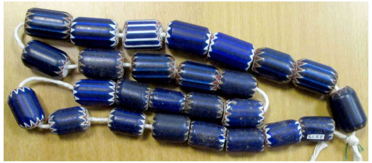 ETHNOGRAPHIC: AFRICA: trade bead necklace (389g), Opitz p.42, string of classic 4-layer "rosetta" chevron beads, with 26 large blue, white and red beads ranging from 14mm to 18mm in diameter, lovely example, EF, ex Charles Opitz Collection.