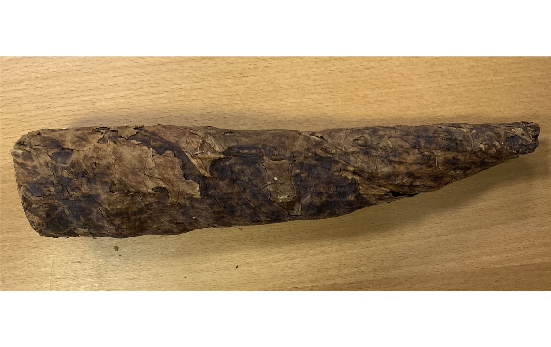 ETHNOGRAPHIC: PACIFIC: INDONESIA: Western New Guinea, tobacco stick, Opitz (2011) p.588 (plate example), 29cm-long and 6.3cm-wide at its widest, made from numerous layers of rolled-up tobacco leaves and quite fragrant, used by the Dani people of the central highlands, VF, ex Charles Opitz Collection. Visit www.traditionalmoney.com for a downloadable copy of Odd & Curious and Traditional Money (Opitz, 2011).
