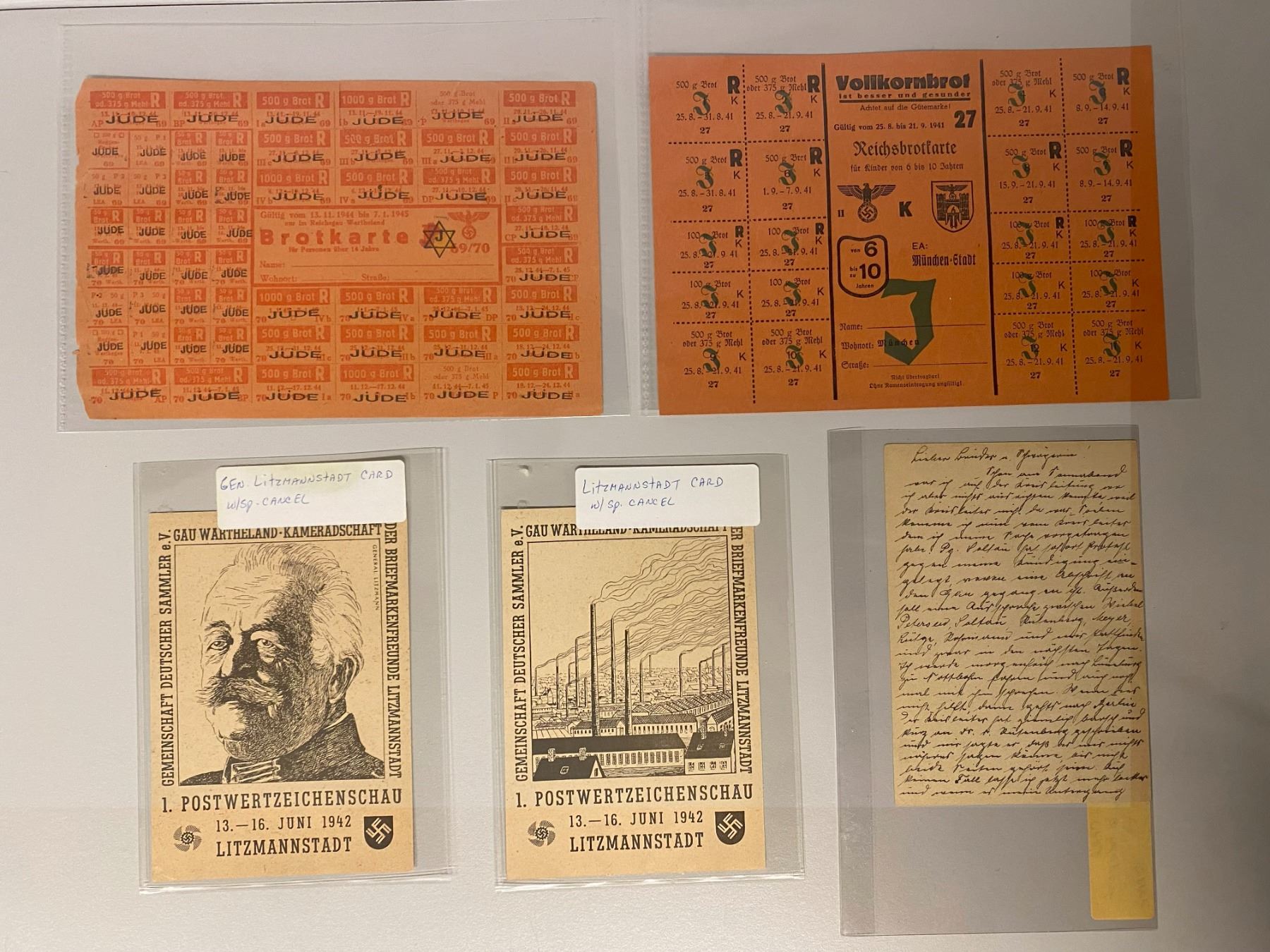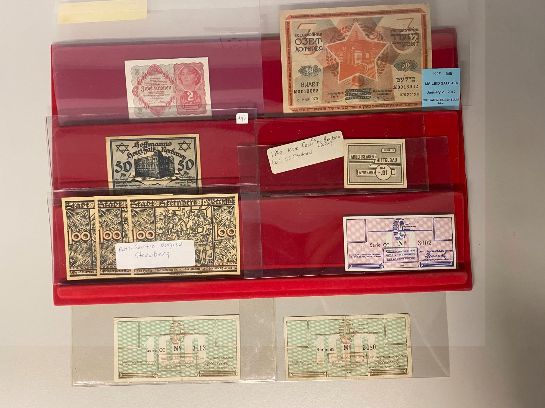 EUROPE: LOT of 14 notes and ephemera, concentration camp money and ephemera, including Nordhausen (Germany) (1 pc), Westerbork (Netherlands) (3), Austria (1, 2 kronen note with anti-semitic reverse oberprint), Norderney (Germany) (1 notgeld), Sternberg (Germany) (3, anti-semitic Notgeld), Germany (1, Chamberlain caricature postcard), Germany (2, bread ration cards with overprint for Jews), Litzmannstadt (Poland) (2, postcards for postage stamp ehibition), and Russia/USSR (1, 1930 lottery ticket in Russian and Hebrew); average circulated grades, as well as many uncs, in consignor's holders, viewing recommended; retail value $550, lot of 14 pieces, ex Dr. Robert A. Rosenfeld Collection.