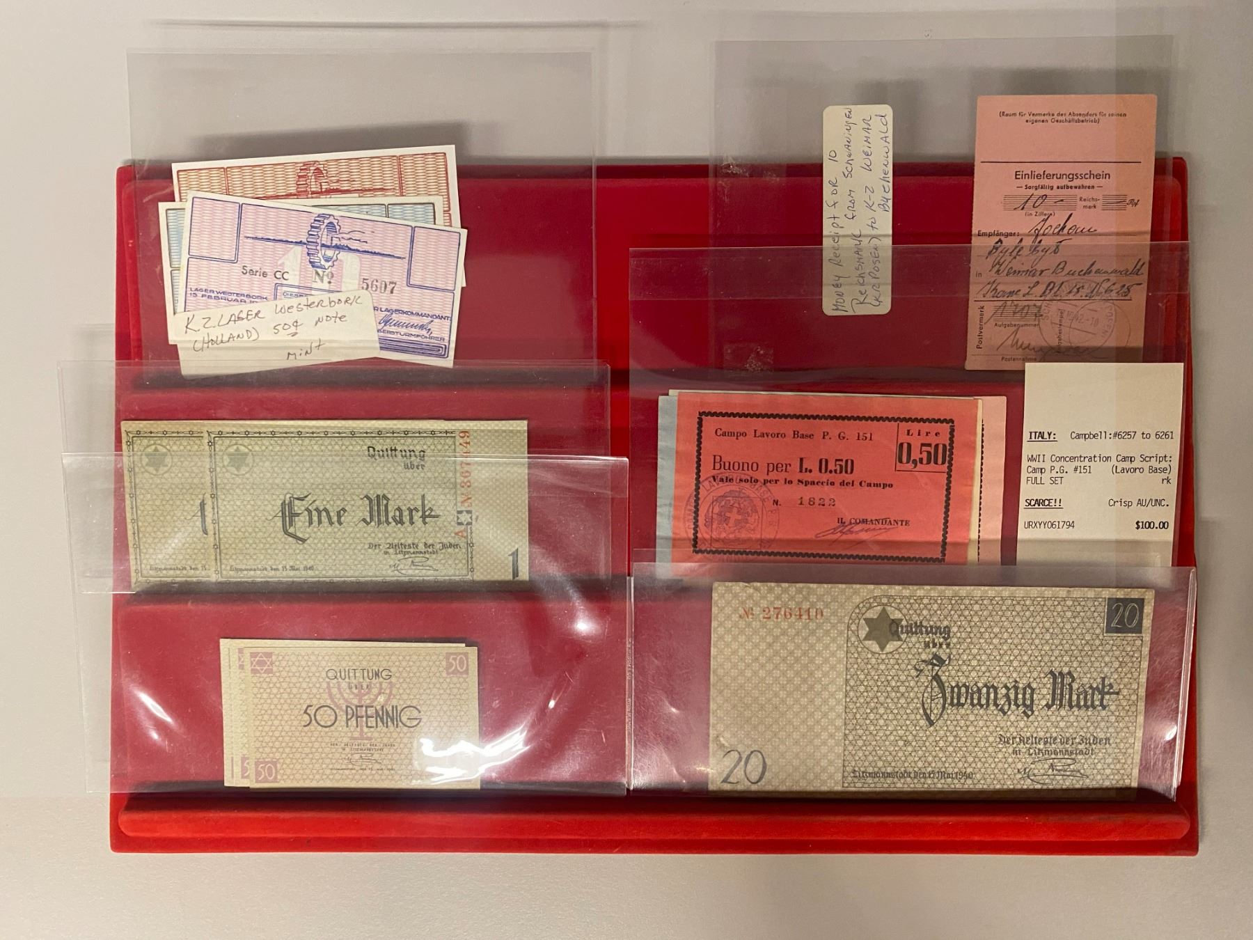 EUROPE: LOT of 14 notes, concentration camp and related issues, including Campo Lavoro (Italy) (4 pcs), Westerbork (Netherlands) (3), Litzmannstadt (Poland) (6), and Posen (Poland)/Buchenwald (Germany) (1, money receipt); average circulated grades, as well as many uncs, in consignor's holders, viewing recommended; retail value $625, lot of 14 pieces, ex Dr. Robert A. Rosenfeld Collection.