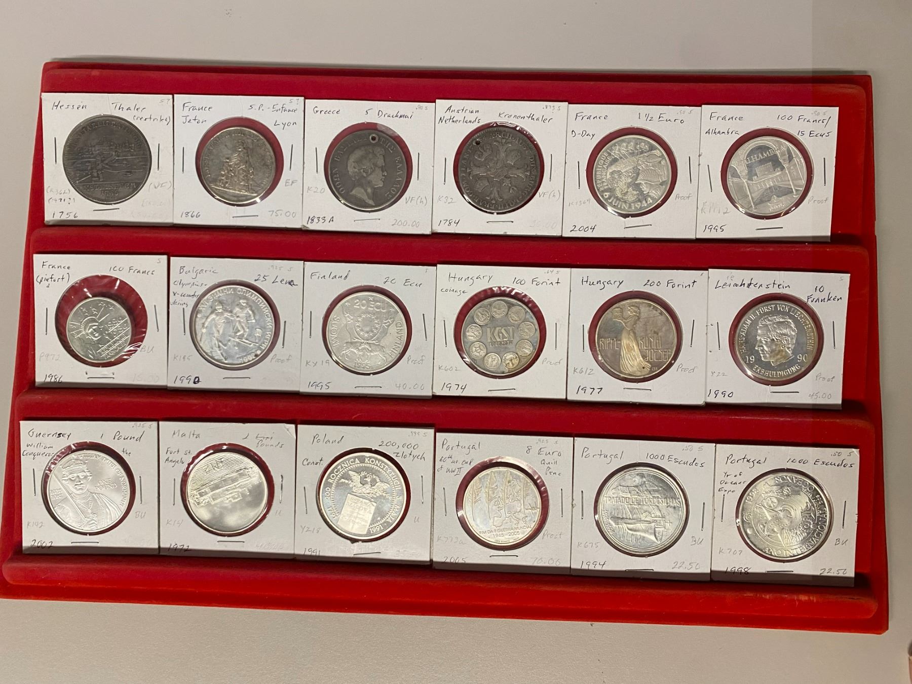 EUROPE: LOT of 35 crowns, including crown sized coins and medals, 29 of which are silver (21 are modern BU and proof coins), with an 1833 5 drachmai and 1784 Austrian Netherlands kronenthaler (both aVF and holed), a 1793 West Freisland 3 gulden, a 1784 Bearn ecu, a 1765-A Bavaria thaler and a French 5 francs 1873-A (all 4 F-VF); retail value $1,000, lot of 35 pieces.