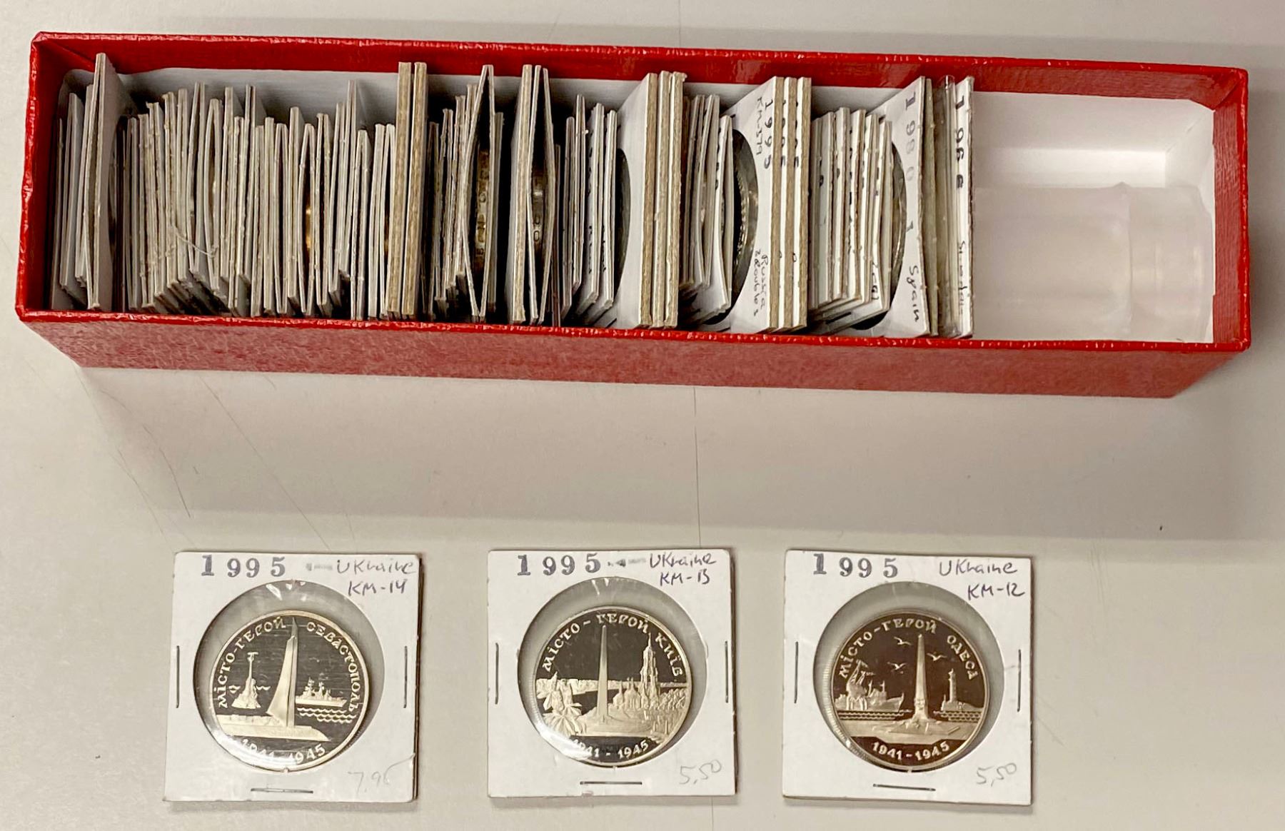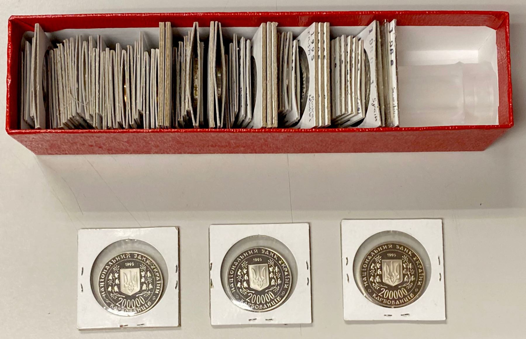 EUROPE: LOT of 71 coins, medals, and tokens, including Greece (13 pcs, including 2 medals), Hungary (1), Iceland (3), Ionian Islands (2), Ireland (3, including one gunmoney and one token), Isle of Man (1), Italy (2), Lithuania (2), Lundy (2, fantasies), Monaco (1), Netherlands (5, including gas token), Norway (2), Poland (9), Russian Empire (1), Russia/USSR (4), Russian Federation (3), Saarland (2), Slovenia (3), Spain (4), Sweden (3), Switzerland (2), and Ukraine (3); average circulated grades, with some better (including 6 proofs), many in silver, in consignor's holders, viewing recommended; retail value $1075, lot of 71 pieces.