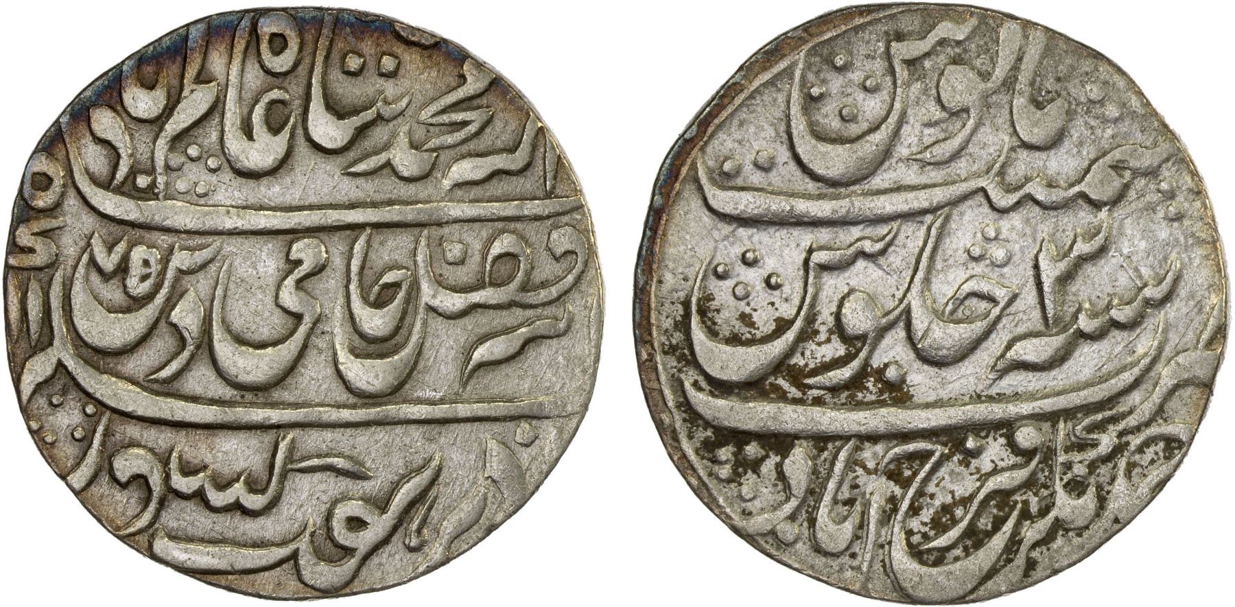 FARRUKHABAD: AR rupee, Ahmadnagar-Farrukhabad, AH1175 year 3, KM-28, in the name of Mughal emperor Shah Alam II, full strike on broad flan, VF, ex David Fore collection.
