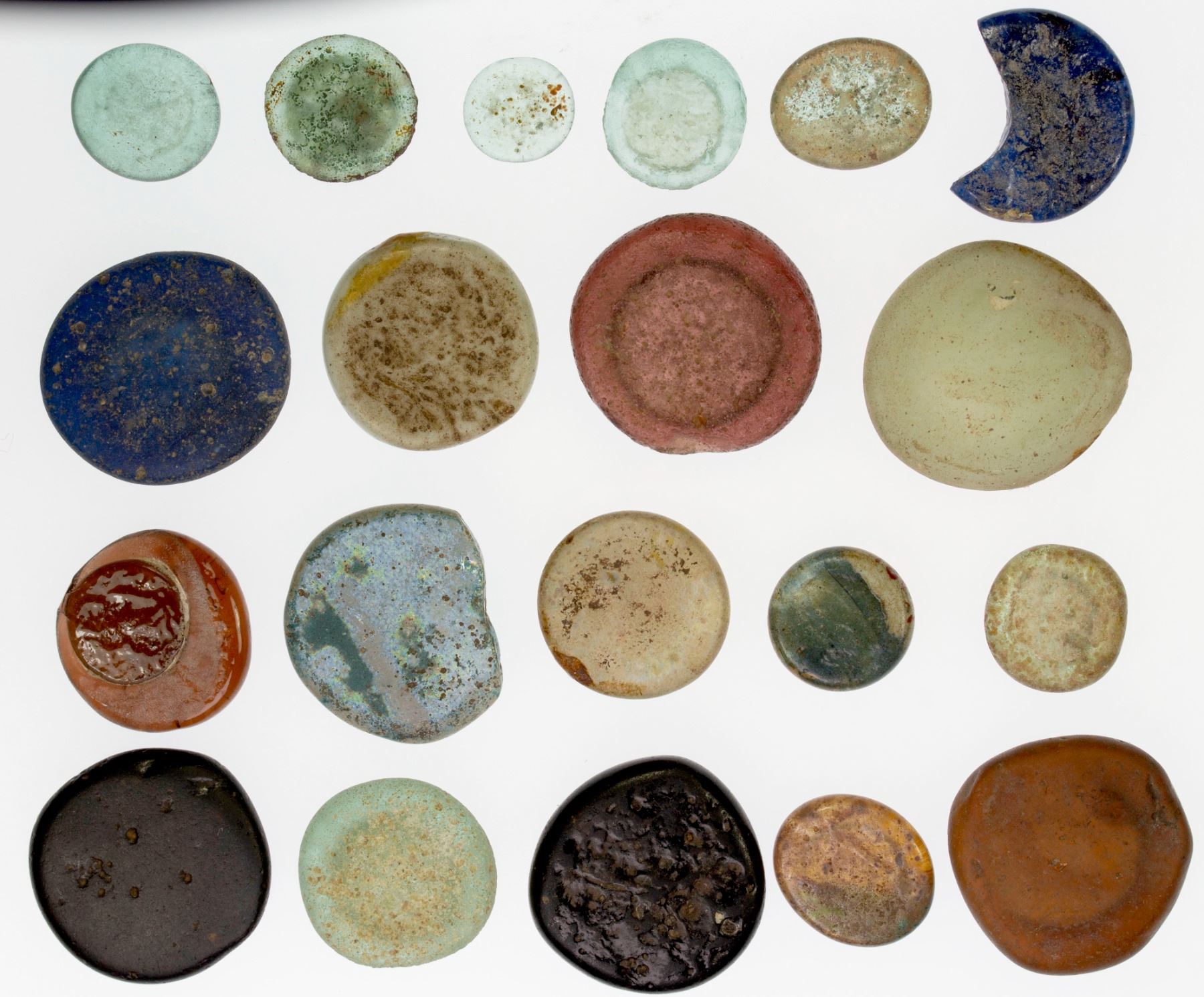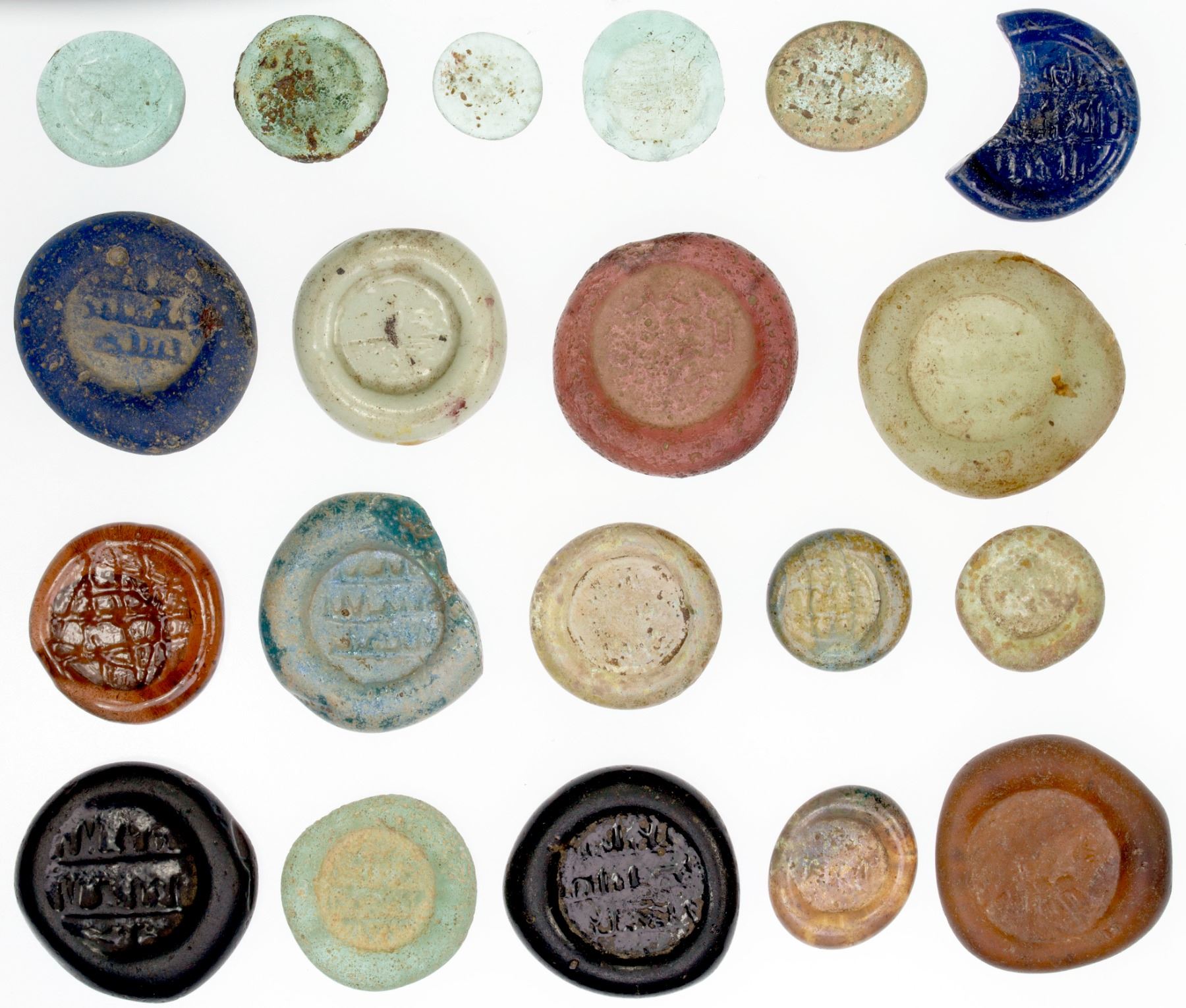 FATIMID: COLLECTION of 20 glass weights (jetons), unidentified, most should be identified after some research, including some that should be very late Fatimid or early Ayyubid, average Fine condition, but most with weak or poorly engraved legends; retail value $1000, lot of 20 pieces, ex Ismail al-Imam Collection.