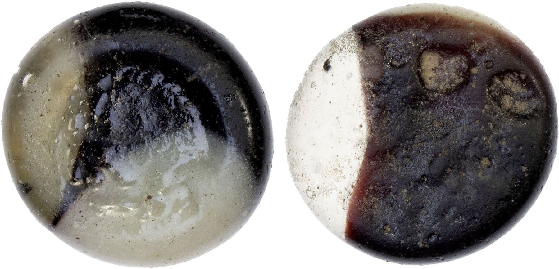 FATIMID: Contemporary imitation, 11th/12th century, glass weight (jeton) (1.50g), A-746G, 2-line blundered Arabic inscription, remarkable mixed-color varieties, part pure white, part rose, part dark brown; translucent, crude VF-XF, ex SARC Auction 12, lot 343, ex Ismail al-Imam Collection.