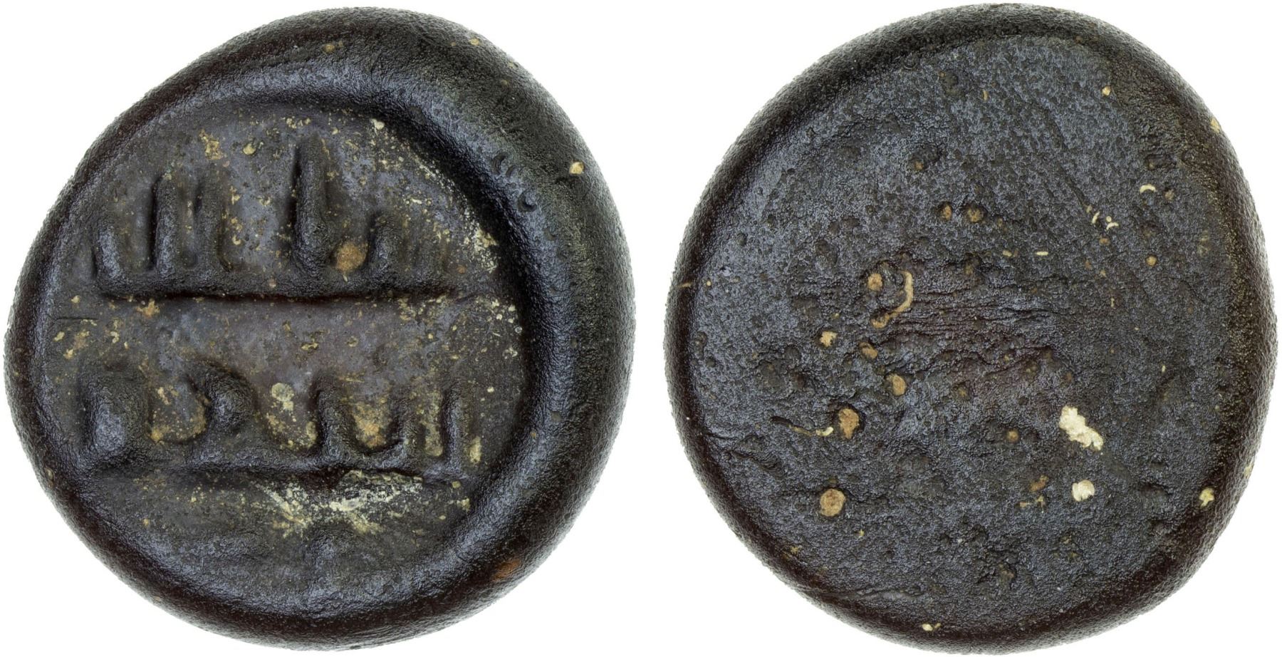 FATIMID: Contemporary imitation, 11th/12th century, glass weight (jeton) (2.90g), A-746G, 2-line blundered Arabic inscription, dark brown, virtually opaque, bold VF, ex SARC Auction 12, lot 344, ex Ismail al-Imam Collection.