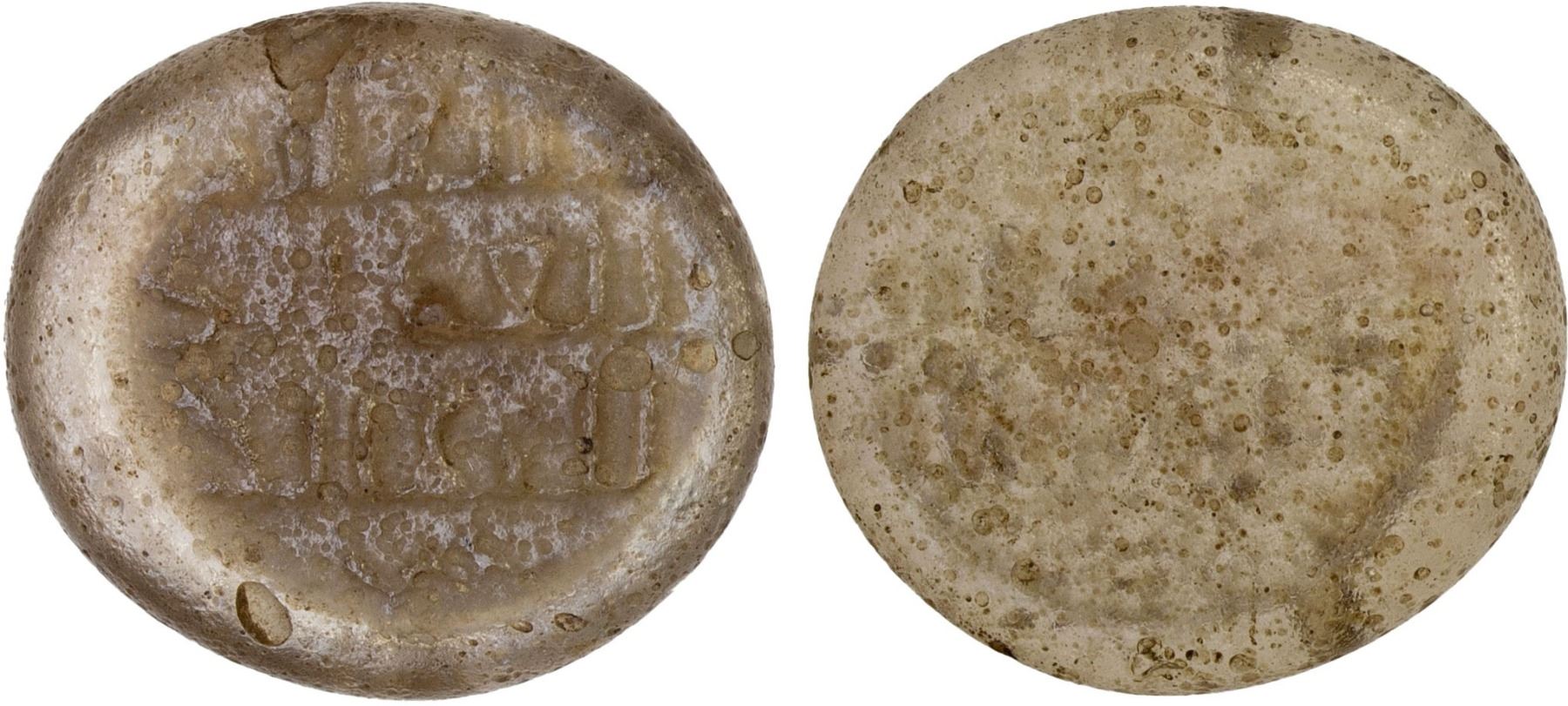FATIMID: Contemporary imitation, 12th/13th century, glass weight (jeton) (2.29g), A-746G, 3-line blundered Arabic inscription, very light green with trace of brown (so-called "natural" color), translucent, VF, ex SARC Auction 12, lot 333 (called Fatimid), ex Ismail al-Imam Collection. The pseudo-Arabic text possibly derived from Fatimid glass weights of al-Mustansir (1036-1094) or al-'Âmir (1101-1130).