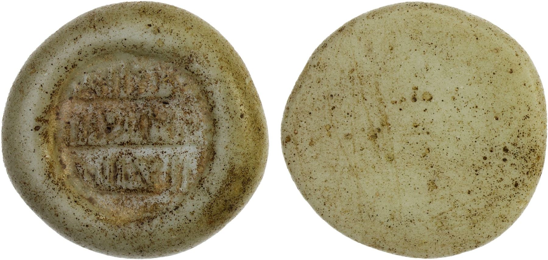 FATIMID/EARLY AYYUBID: Contemporary imitation, 12th/13th century, glass weight (jeton) (5.81g), A-746G, 3-line blundered Arabic inscription, gray, virtually opaque, VF, ex SARC Auction 12, lot 338 (called Fatimid), ex Ismail al-Imam Collection. The pseudo-Arabic text possibly derived from Fatimid glass weights of al-'Âmir (1101-1130).