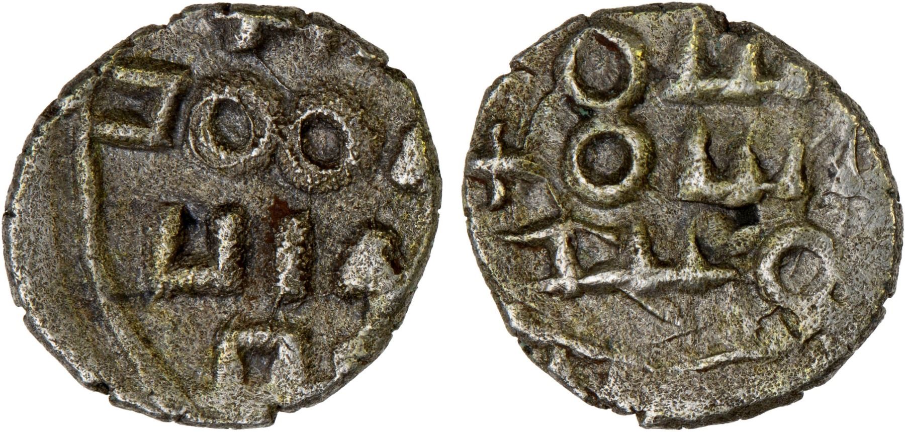 FATIMID PARTISANS AT MULTAN: al-Mu'izz, 365-375, AR damma (0.31g), A-4590, Nicol-510, FT-FG1 (ex A-A702), Isma'ili kalima // caliphal text al-mu'izz lidi- / -n Allah amir / al-mu'minin / ma'add, totally blundered legends, likely based on issues of al-Mu'izz, XF, RR.