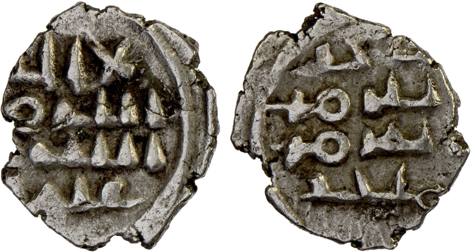FATIMID PARTISANS AT MULTAN: al-Mu'izz, 365-375, AR damma (0.32g), A-4590, Nicol-510, FT-FG1 (ex A-A702), Isma'ili kalima // caliphal text al-mu'izz lidi- / -n Allah amir / al-mu'minin / ma'add, blundered legends, especially on the reverse, contemporary imitation or emergency issue, XF, RR.