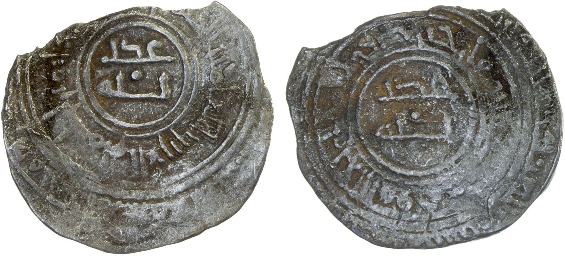 FATIMID: al-'Aziz, 975-996, AR ½ dirham (1.07g), MM, DM, A-705S.1, Nicol, with the words 'adl / lillah in both the obverse center and the reverse center, with the mint possibly sijilmâsa in the reverse margin, date unclear; chipped; unpublished and probably unique, the third version of the Sijilmasa varieties for this reign, all of them unique, F-VF, RRRR. The same two-line central legend as on lot 492 sold in our Auction 45, which shows the mint name Sijilmasa.