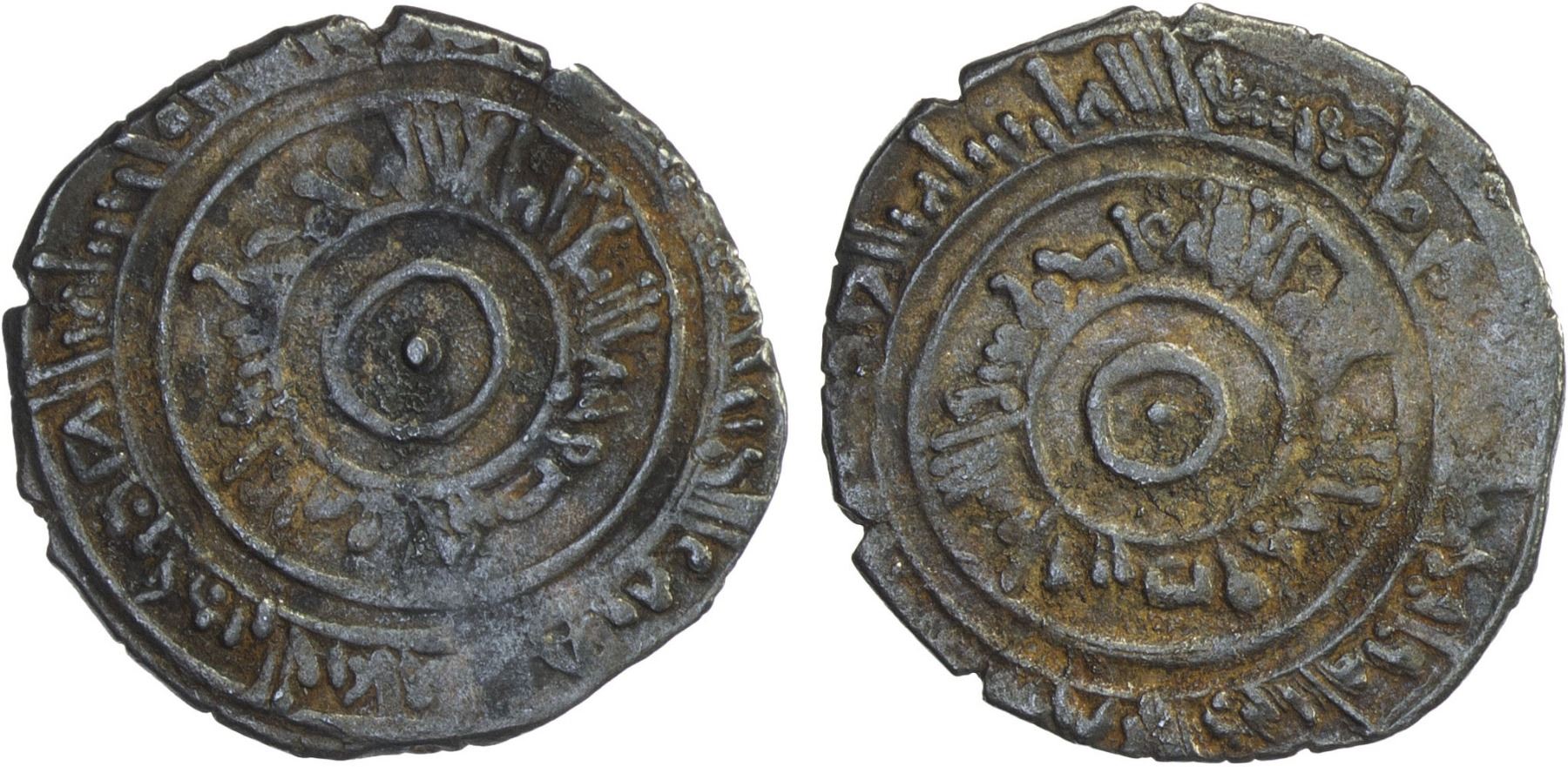 FATIMID: al-'Aziz, 975-996, AR ½ dirham (1.26g), A-705, muling of two reverses, hence no mint and date; interesting mint error, F-VF, RR.