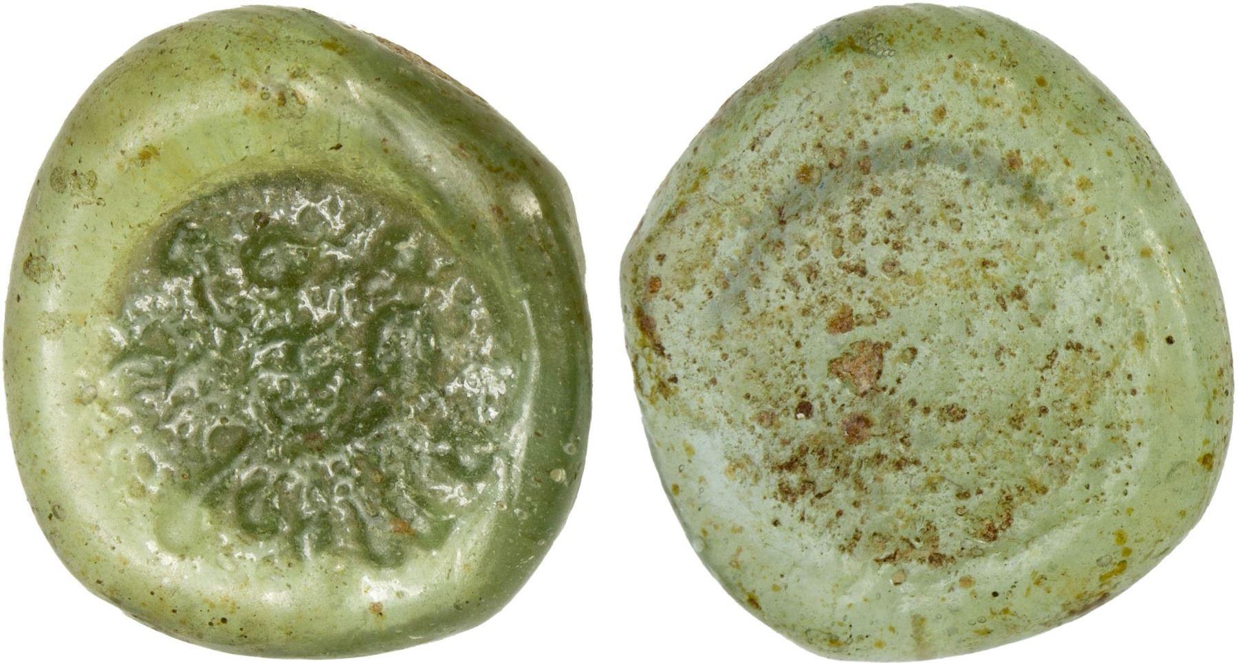FATIMID: al-'Aziz, 975-996, glass weight (jeton) (1.46g), A-708, FGJ-31, circular legend amara bihi nizar al-'aziz billah around an annulet, pale yellow-green, translucent, grainy surface (from casting process), F-VF, ex Ismail al-Imam Collection.
