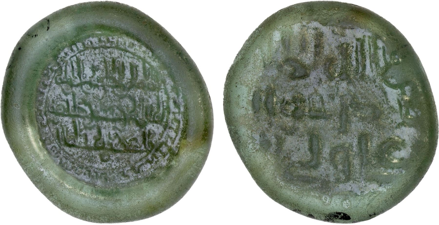 FATIMID: al-Hakim, 996-1021, glass weight (jeton) (2.97g), A-713, FGJ-146, 3-line inscription al-hakim bi-amr Allah / amir al-mu'minin wa khalifatuhu / wali 'ahd al-muslimin // Shi'ite kalima on reverse, bluish green, translucent, VF-XF, ex SARC Auction 12, lot 274, ex Ismail al-Imam Collection.