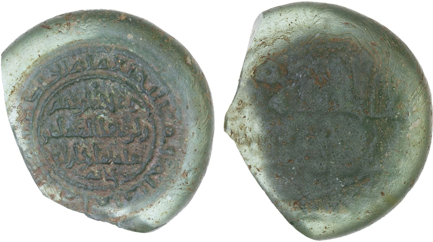 FATIMID: al-Hakim, 996-1021, glass weight (jeton) (6.34g), AH408, A-713, FGJ-171, citing al-Hakim in the margin and both the heir 'Abd al-Rahman and the date 408 in words in the center // Shi'ite kalima (usual weakness); chipped twice but fully legible obverse legends on both sides; green, translucent, VF-XF, R, ex SARC Auction 12, lot 279, ex Ismail al-Imam Collection. Actual weight for this size should be about 8.45g, the weight of two gold dinars.