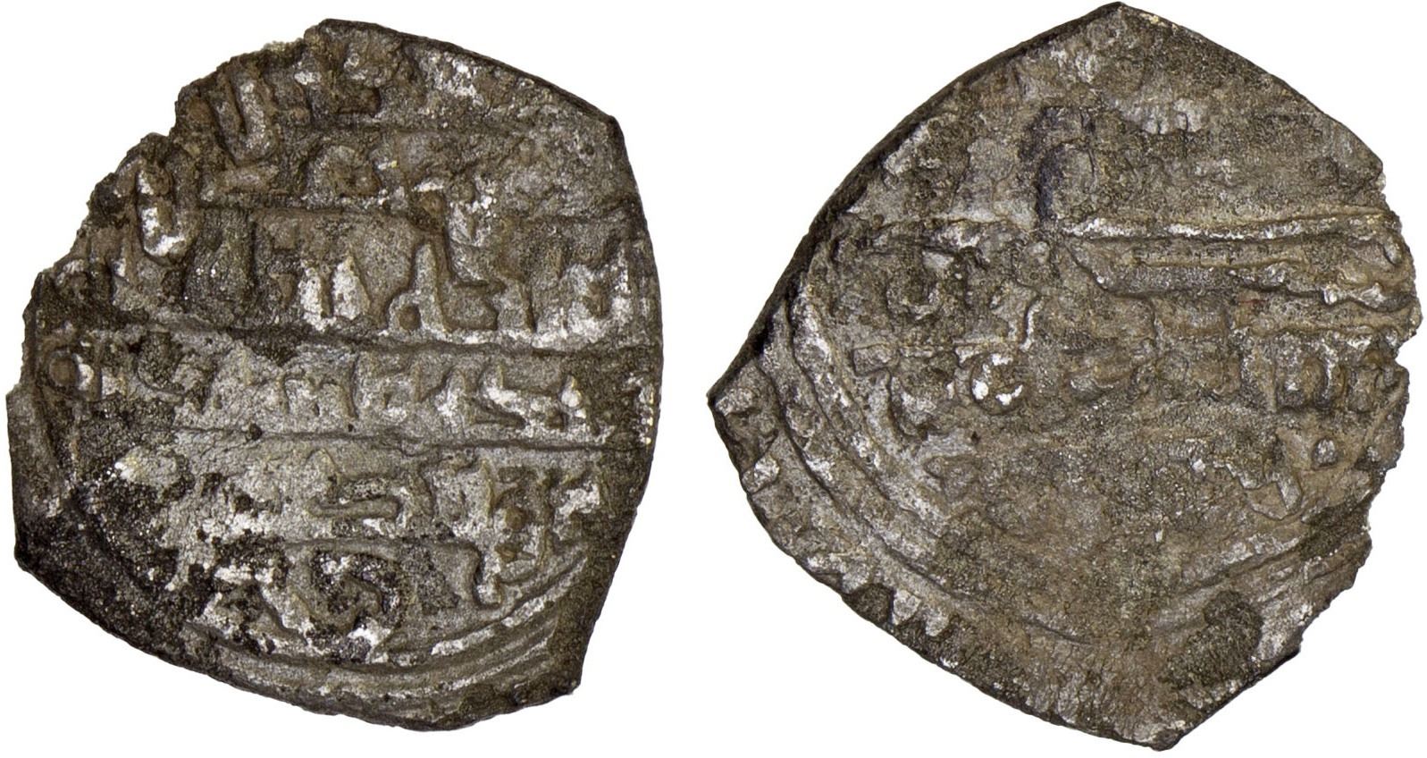 FATIMID: al-Mansur, 946-953, AR 1/4 dirham (0.39g), MM, DM, A-696H, citing the Imam's kunya abu'l-tahir below the obverse field, noted only on issues of Fès; corroded and probably partially clipped, VG-F, RRR.