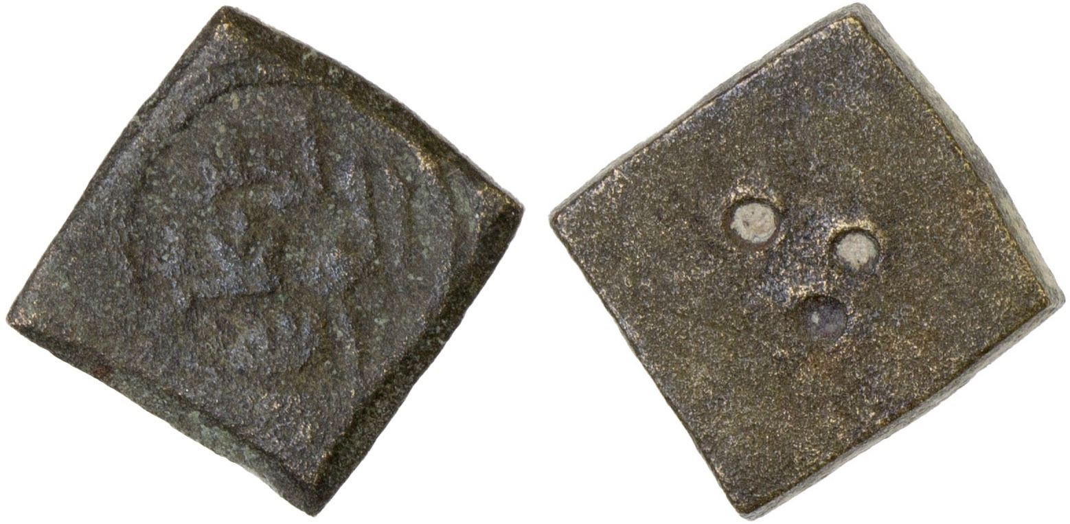 FATIMID: al-Mu'izz, 953-975, AE square weight (1.42g), name al-mu'izz li-din Allah on the obverse, three dots on the reverse; weight for the silver half dirham, pleasing F-VF, RR.