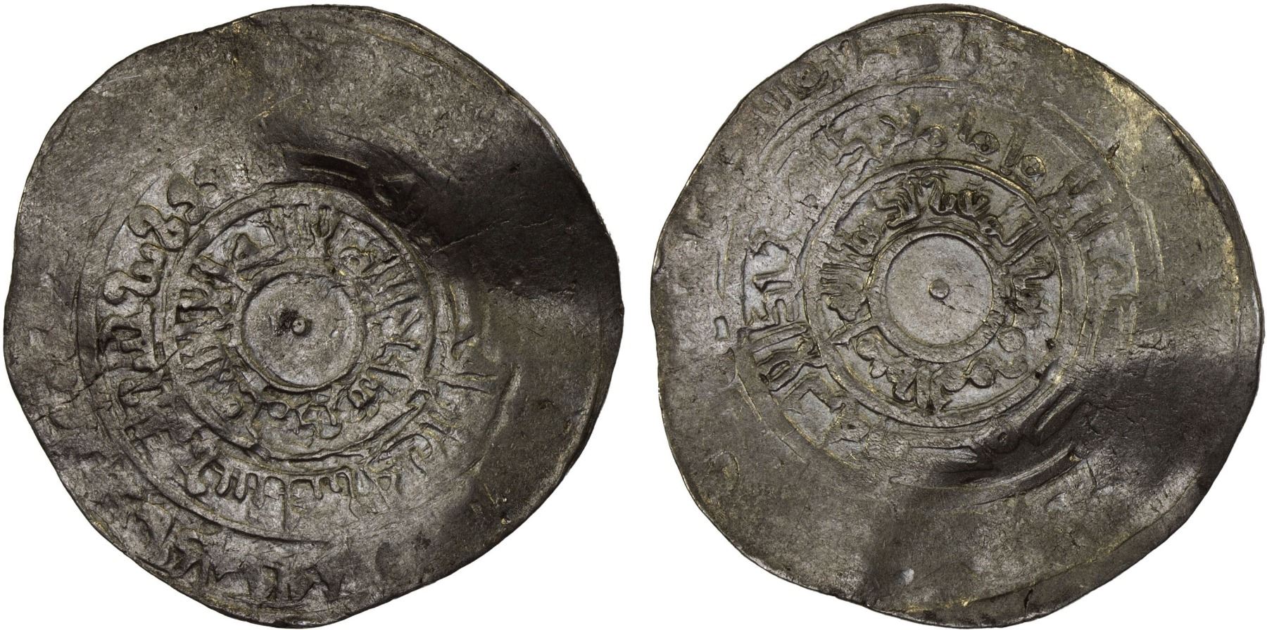 FATIMID: al-Mu'izz, 953-975, AR broad dirham (3.24g), Filastin, AH(36)4, A-W699, Nicol-342A, mint name weak but legible, only the first two letters of arba' for "4" are clear enough, thus it must be 364, about 25% flat strike, VG.